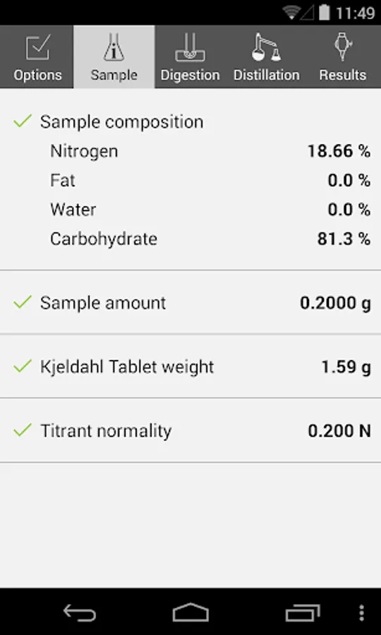 Calculate optimized digestion and distillation parameters for the nitrogen determination according to Kjeldahl. The calculator outputs the following digestion parameters: