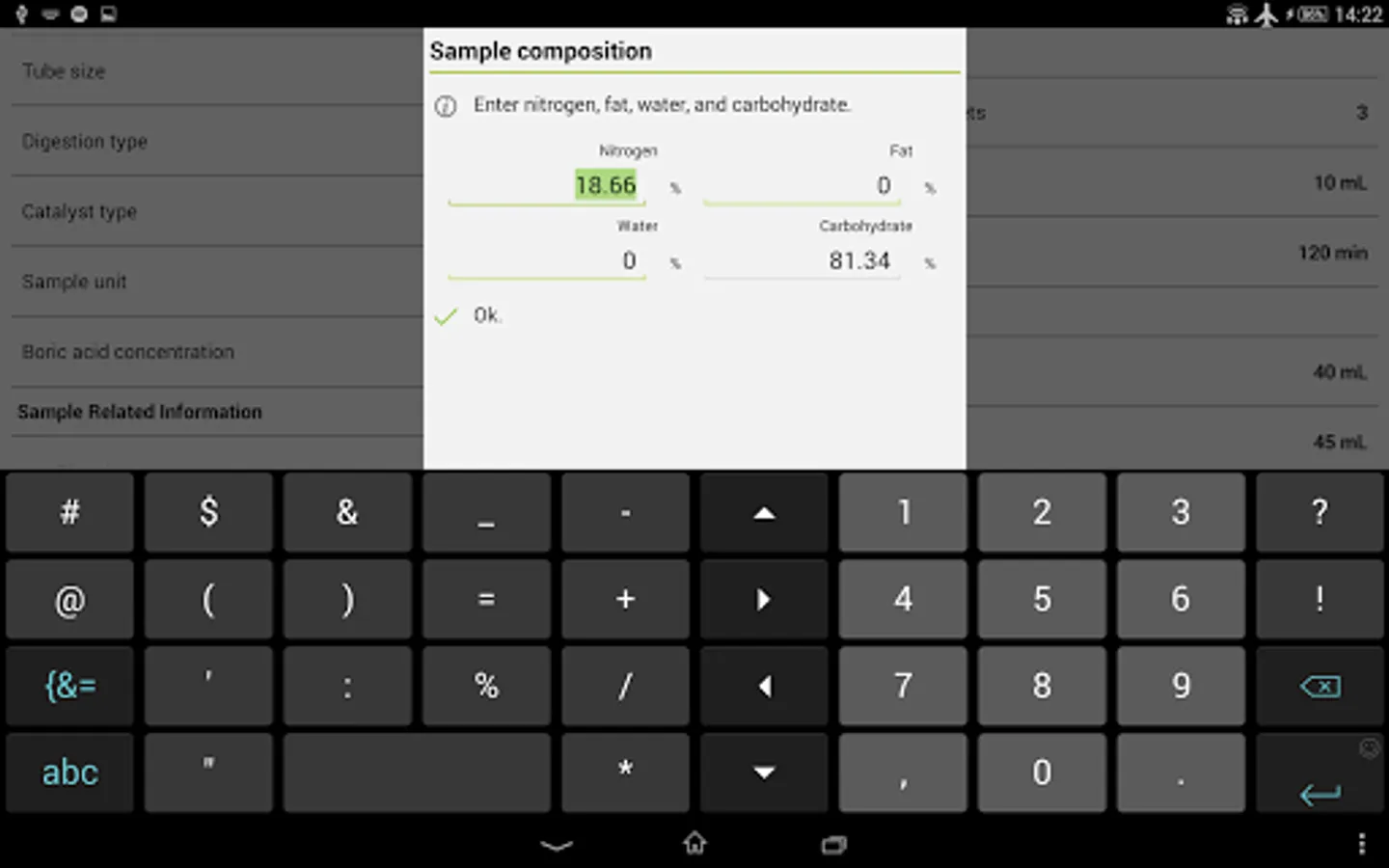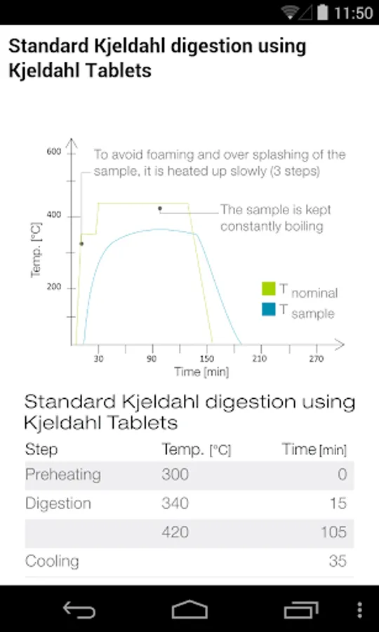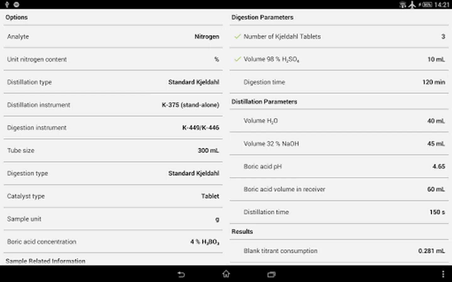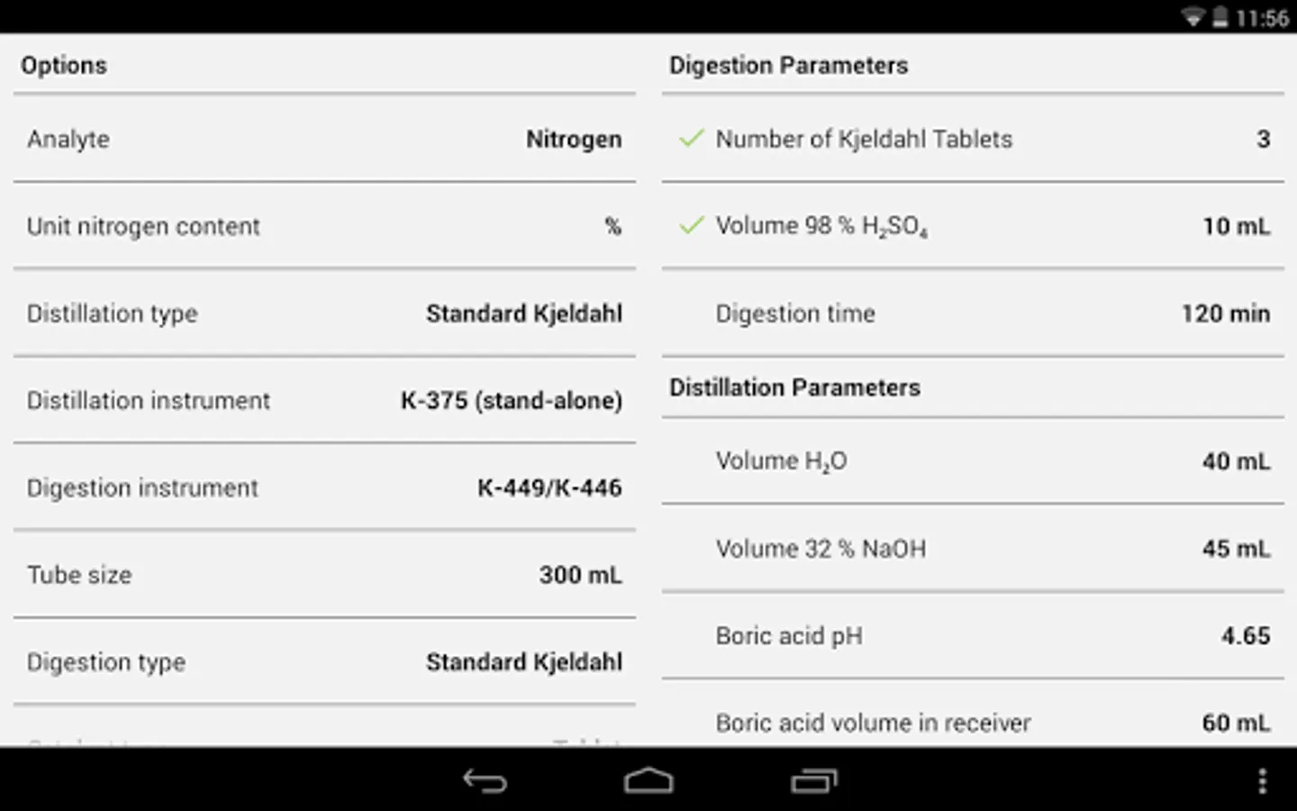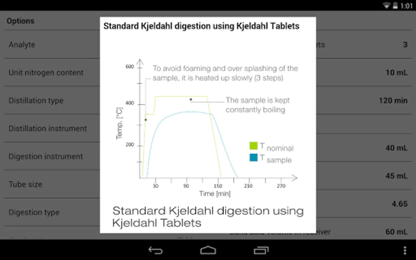 It also contains helpful information to other parameters such as the digestion and distillation time, pH and volume of the boric acid and the steam power.