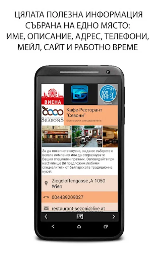A contact with Bulgarians doctors, dentists, pharmacies, lawyers, translators, accountants, real estate brokers and many other interesting and important companies and people in Vienna and Austria. All the necessary information practically in one place and always handy in your mobile phone - address, phone, website, email, working time.