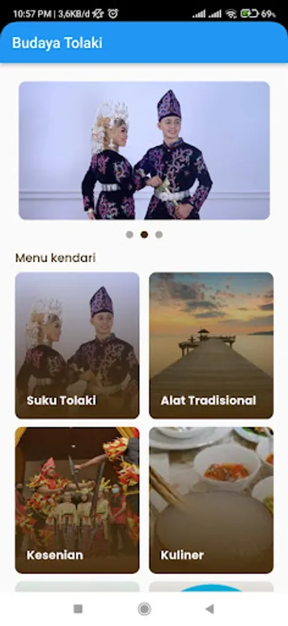 This Tolaki culture application is an application specifically dedicated to introducing and promoting Tolaki culture to users. This application provides various information, images and other content related to Tolaki culture. By using this application, users can learn more about traditions, customs, art, music, food, and other cultural aspects that are unique to the Tolaki people
