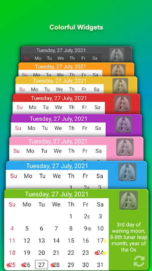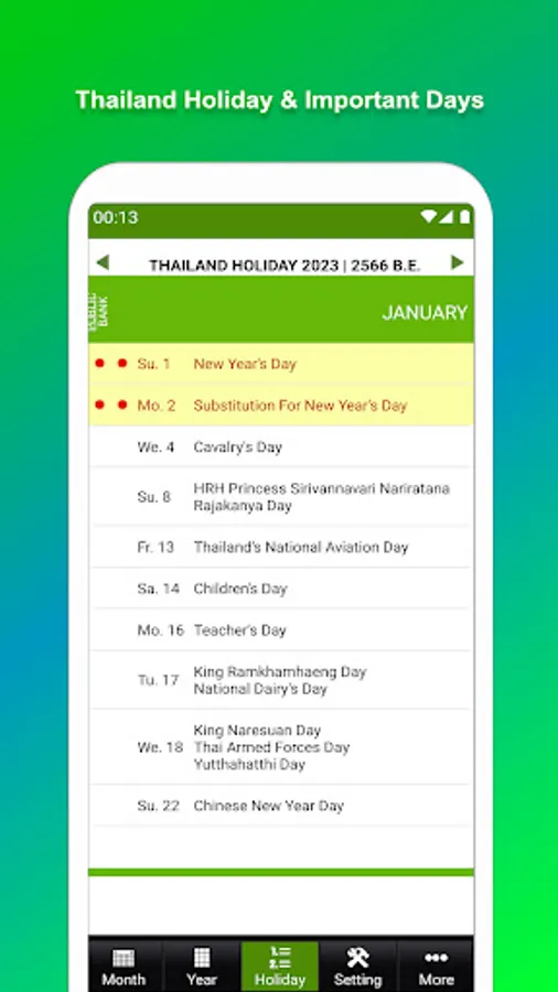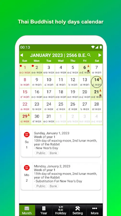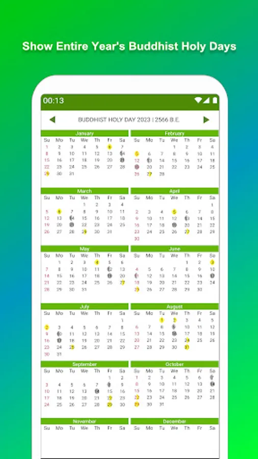 ✔ Display the Buddhist holy days in calendar year format.