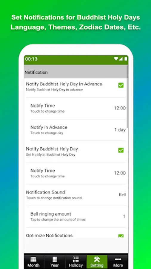 ✔ Notification 1 day before Buddhist holy day .