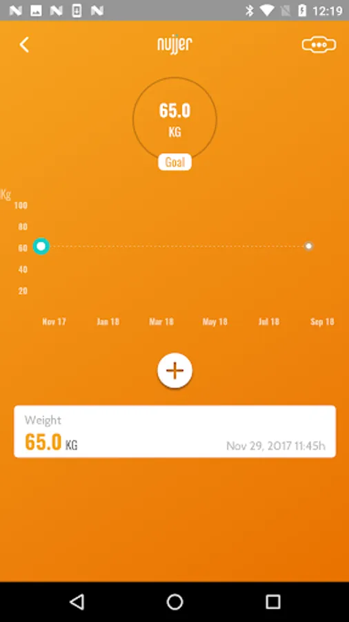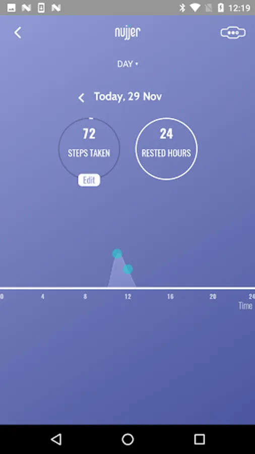 The app displays both day view and week view charts for the user to compare their activity, sleep and events. The app also enables users to enter specific goals around weight and daily step count. These are logged and further goals can be set over the course of using the buddi ct app and nujjer wristband.