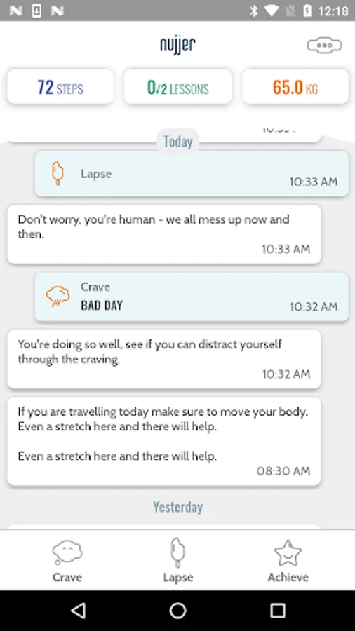The user can log “events” using the functionality on the homescreen. When craving a food, the user clicks “crave” to receive a link to distract them from this crave, they will also receive a message of support to help them through the crave. If the user has lapsed against a crave, they click “lapse” to receive a message of support and advice. If the user feels that they have achieved something, such as a long walk, a day without treats or a 20-minute swim, they press the “achieve” button to register this – again they will receive feedback messages around these achievements.
