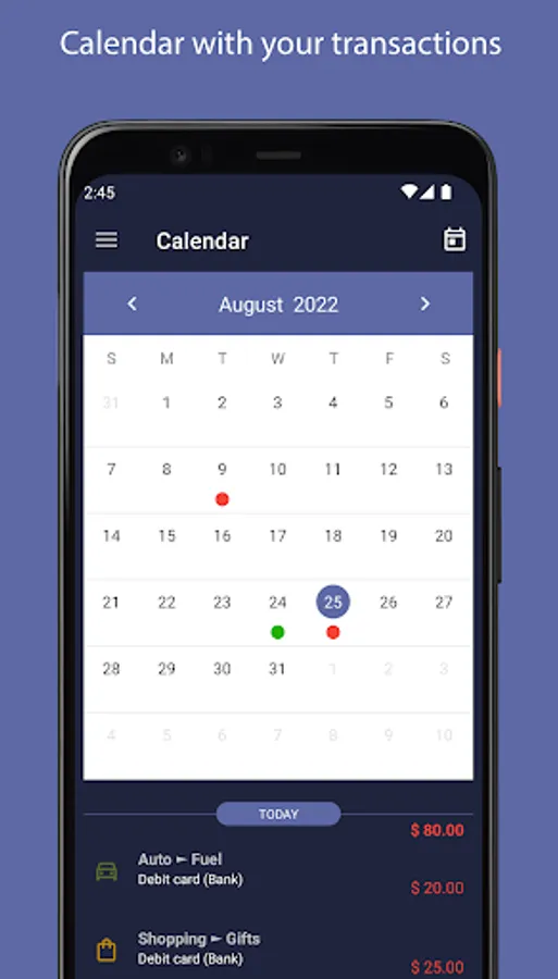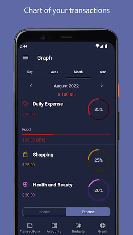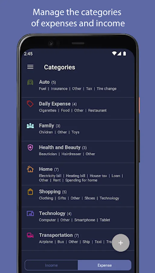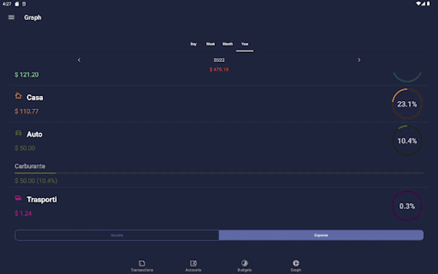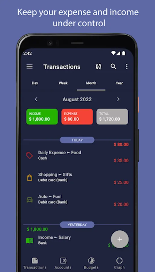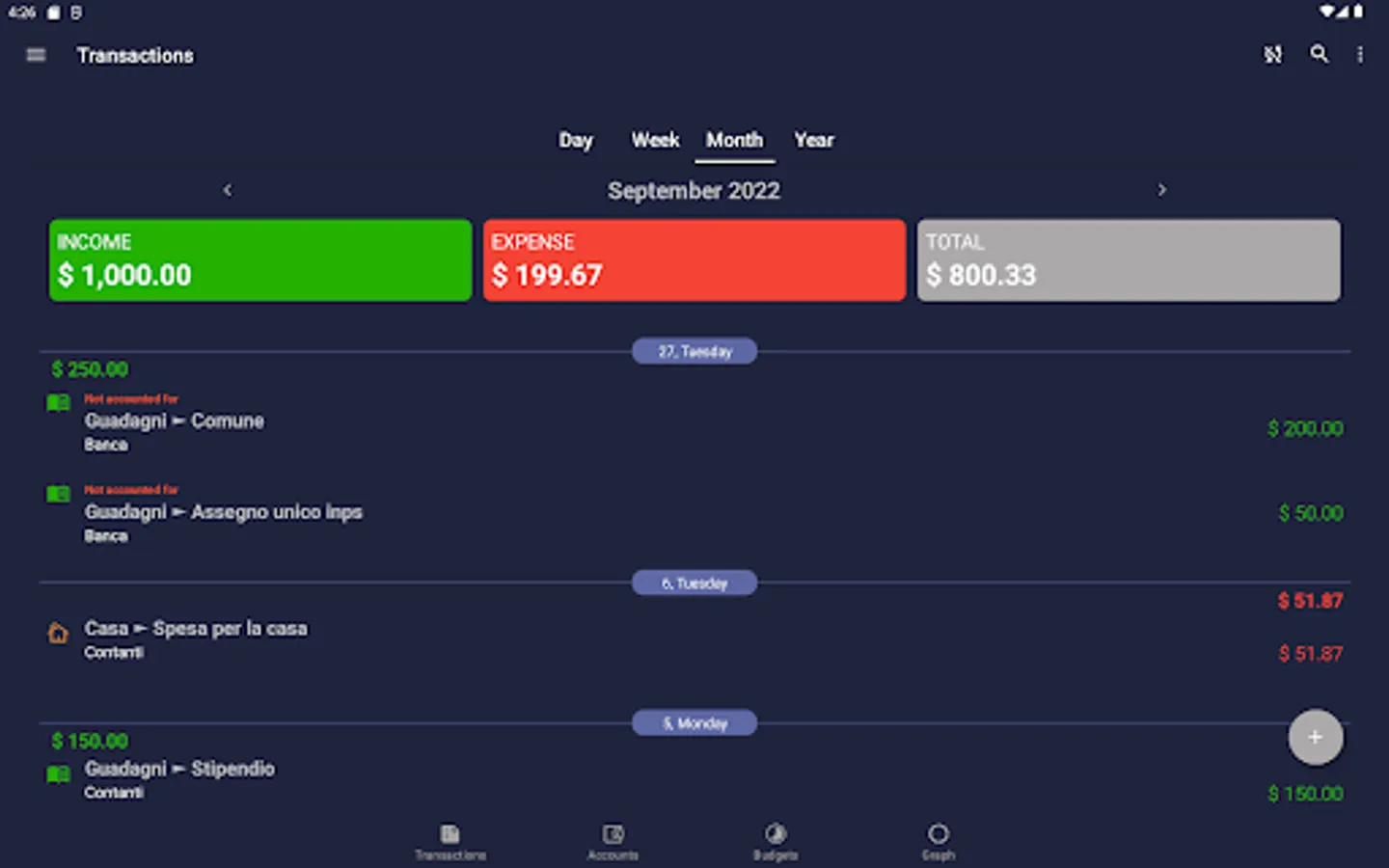 With this app you can store your income and expense. When open app you have an overview of the current month, week, day and year to check how much money you have available.