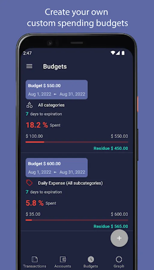 You can see graphs and create custom budget spending, to set future transactions. For example, create a monthly limit for the supply or a weekly limit for purchases, etc ...