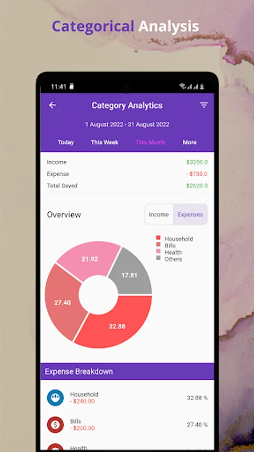 Analytics Provides you with income/expense comparisons helping you to keep your expenses in check. Gives you analytics on what you have been spending on or earning from to date.