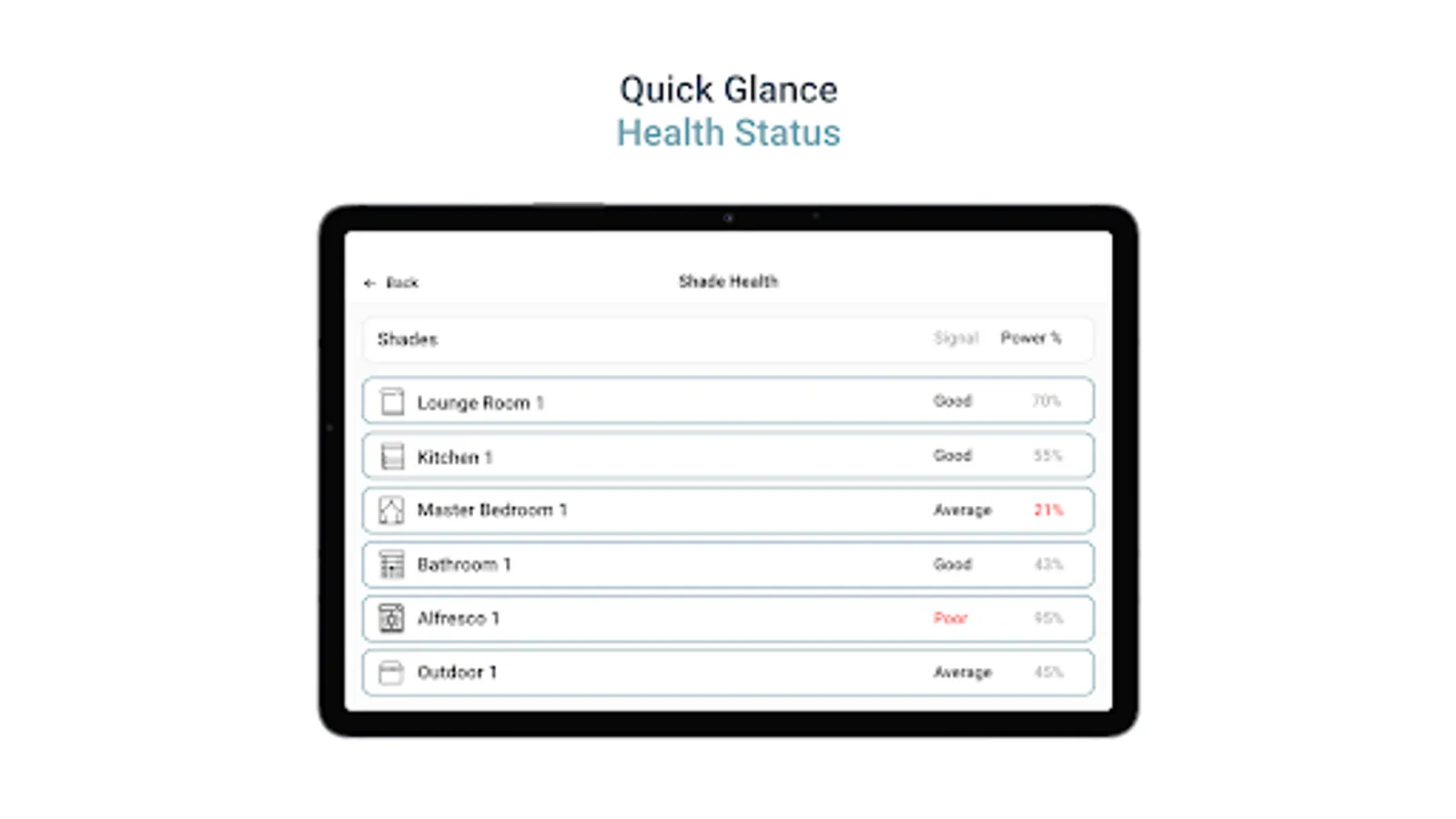 Check the health of your motorized shades at a glance with Battery level and Signal strength icons on your device tiles.