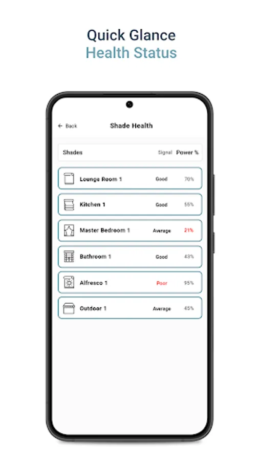 Quickly view the Health Status of all your shades. A summary screen displays the battery levels of all your shades along with signal strength indicators, prompting necessary action to either charge your motors or troubleshoot connections.