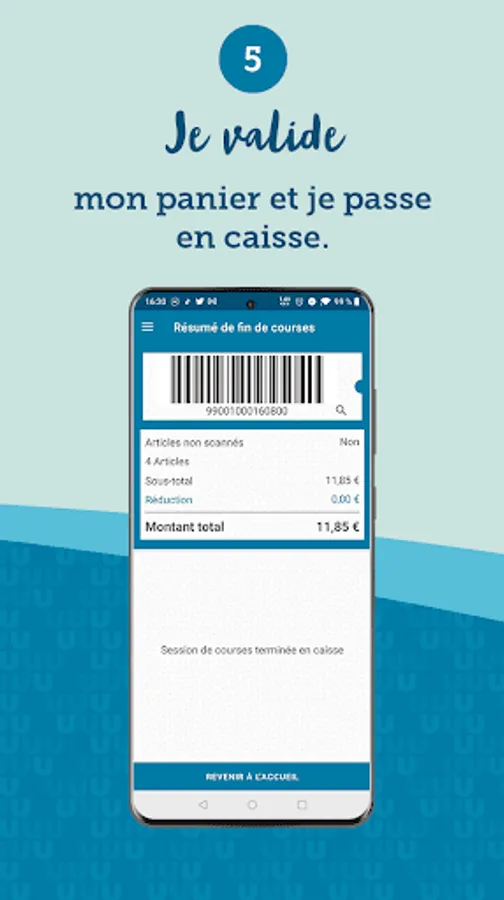I validate the transaction and present myself to the dedicated U scan box where I scan the code displayed on the phone. I make the payment for my cart without having to empty my cart (except when checking the store).