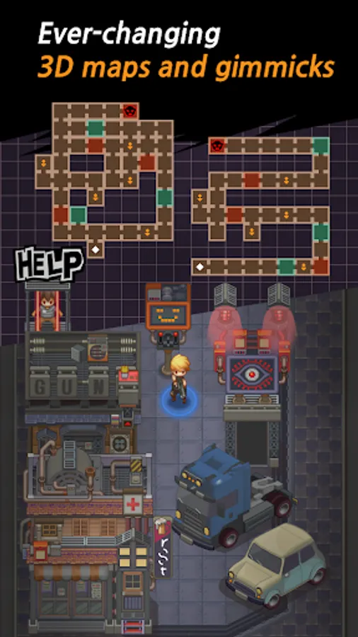 - Enjoy a roguelike shooting game with a unique view point and various stages