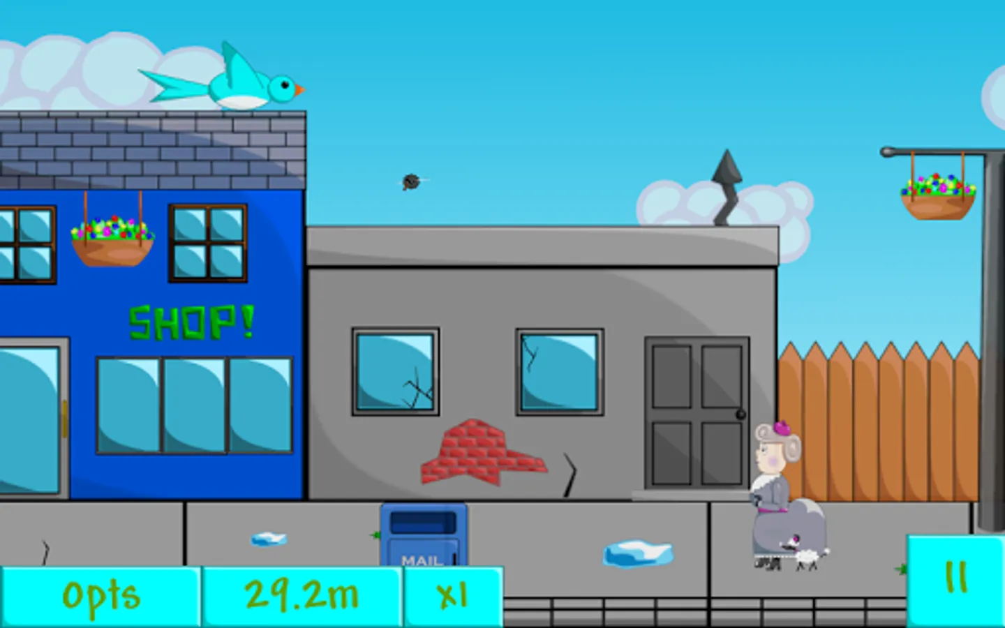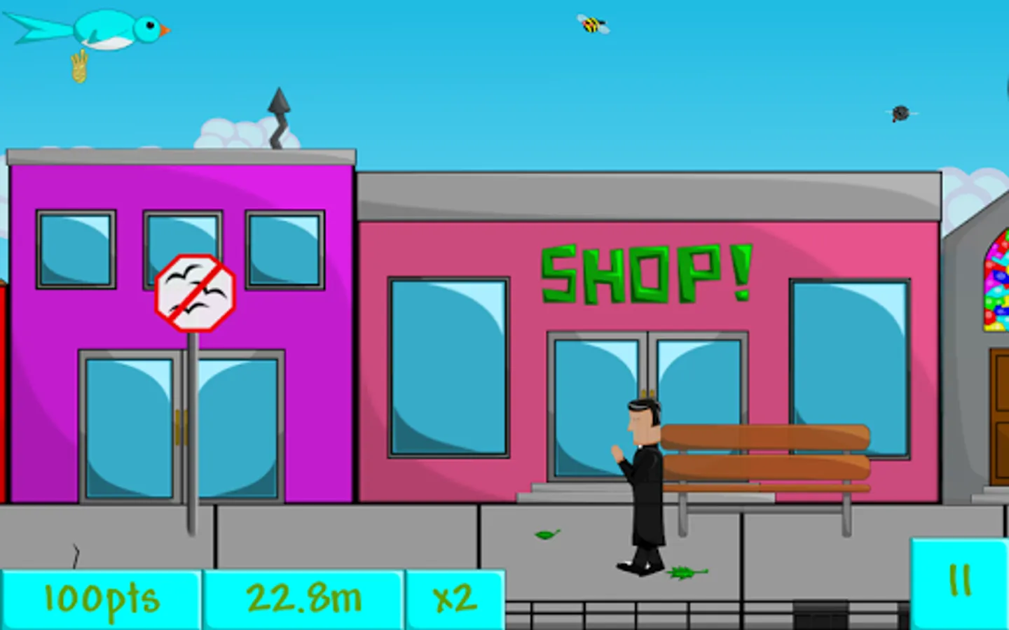 Crappy Bird is a colorful simulation game where you take control of a bird flying high over a busy street and dispense justice on the unsuspecting public, by pooping on them! Score points by pooping on anything you see, including sign posts, mail boxes, flower baskets and even on people, causing them to run from your wrath!