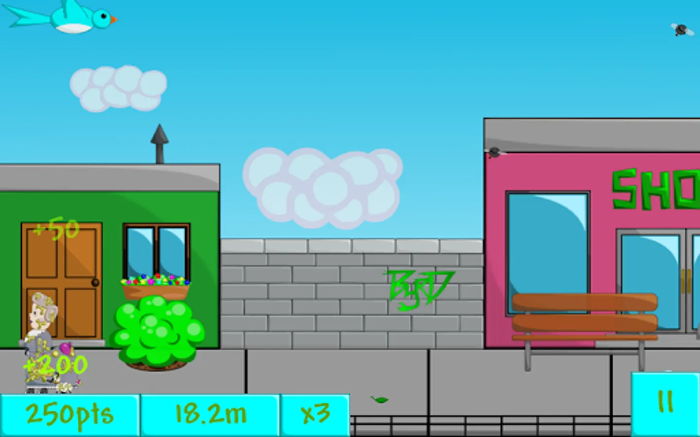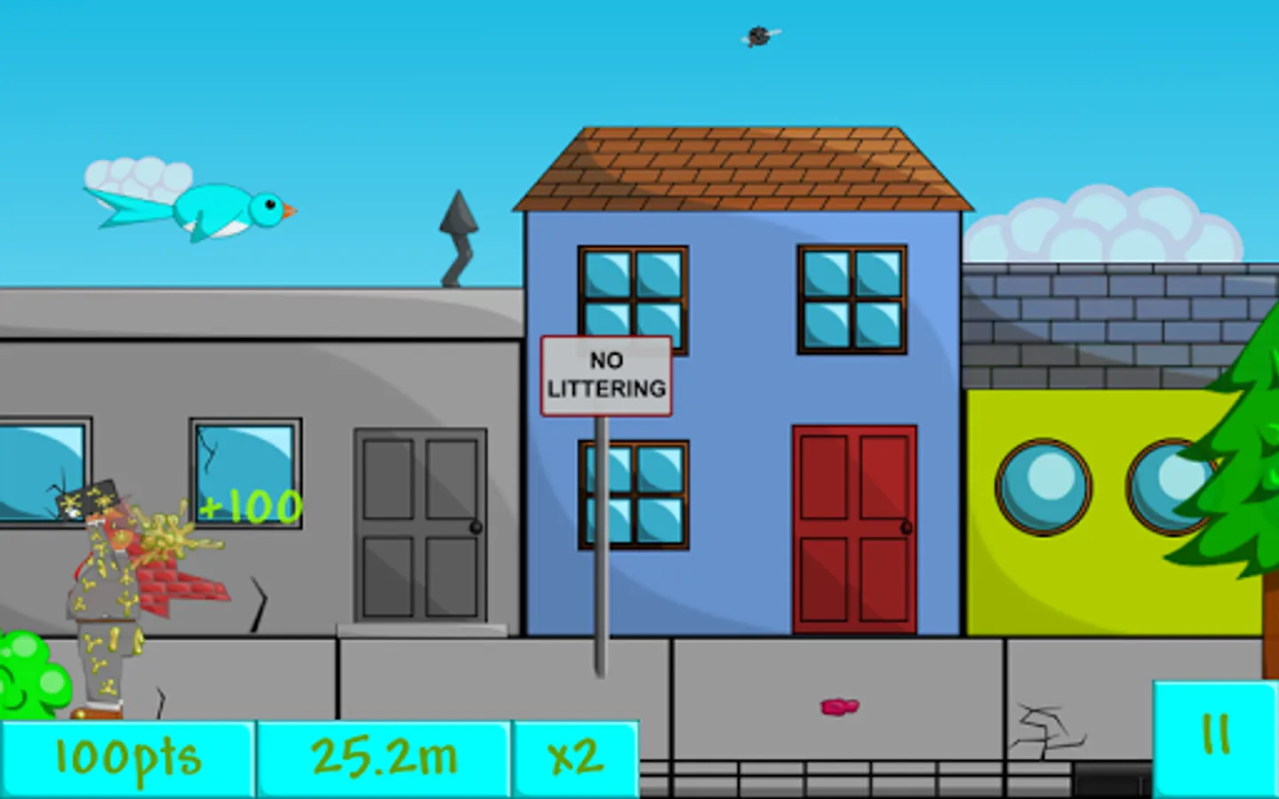 Eat the flies to increase your arsenal, but don't eat too much or you'll end up dropping like a stone! Avoid obstacles like bees, trees and lamp posts as you fly faster and faster along the street, trying to hit targets as they whip by.