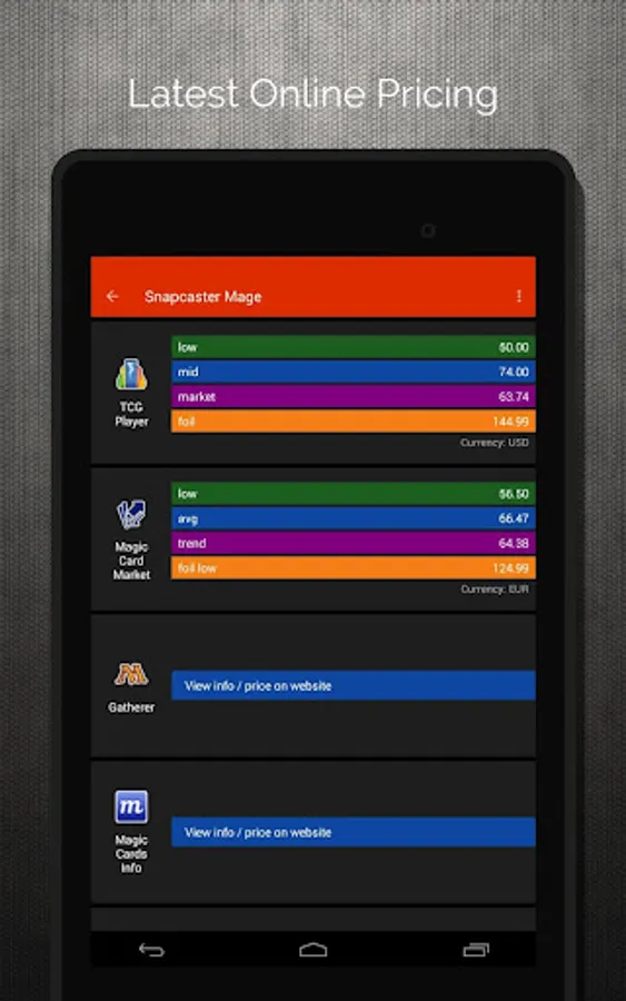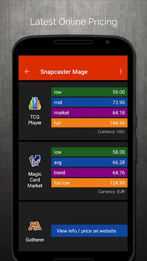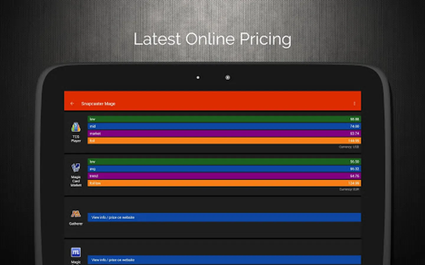 - Latest card pricing including all promo cards, foil cards, different art variety directly from TCGPlayer or Cardmarket.