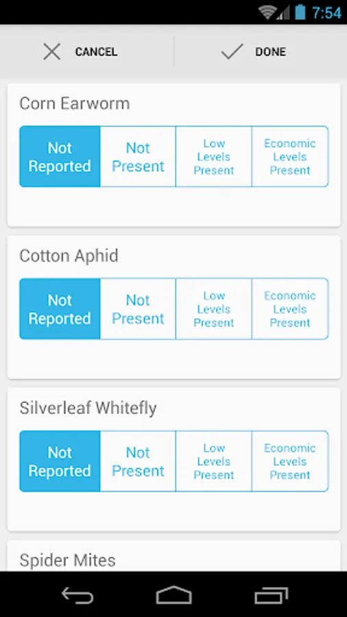 EDDMapS IPM is designed for County Extension Agents, crop advisors and extension specialists to report current pest and disease activity in real time via smartphone. Currently, extension specialists in Georgia are testing this app and commodities are hand-selected, allowing us to refine the basic process and work on getting reliable data. Commodities include blueberry, cotton, wheat, vegetables, grain sorghum, corn and soybean. Only a handful of pests are included, with priority given to pests that affect more than one crop and whose presence in one crop may affect management in another. Agents have the option of reporting monthly, weekly or even daily if they deem it necessary.