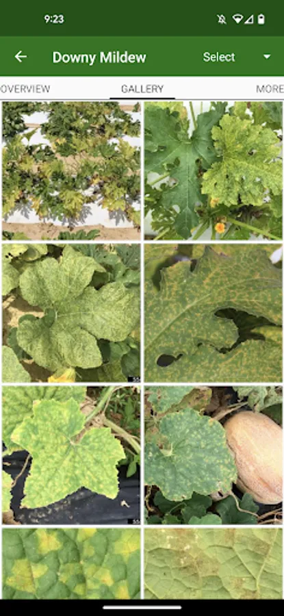 The home screen lets the user choose the crop and discipline (pest or disease) and lets the user update data from the external database. The user can go back to this screen at any time and add or delete a selection. On top of this screen is a search bar that lets the user search active ingredients and trade names. Results will list the crop the product is registered for, the rate per acre and the efficacy rating. Then the user chooses one of the crop and discipline choices. The user taps a crop which opens up the disease or pest page. On any disease page the user can choose a disease by clicking the picture or choosing Overview/Gallery/More to learn more about it. Disease-specific information includes an overview about the disease and its management and a short, 2 to 3 min audio from the regional expert on the bottom of the page. The GALLERY features 6 pictures of disease signs and symptoms and pictures illustrating management solutions. The user can zoom in each picture. In the MORE section, the user finds information about the disease and its causal organism (including disease cycle and symptoms and signs), chemical control information, fungicide resistance information, and non-chemical control information (including biological control options, cultural control options, and resistant varieties). The same features can be pulled up for any pest.