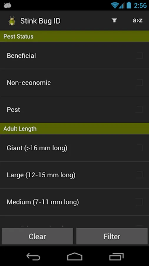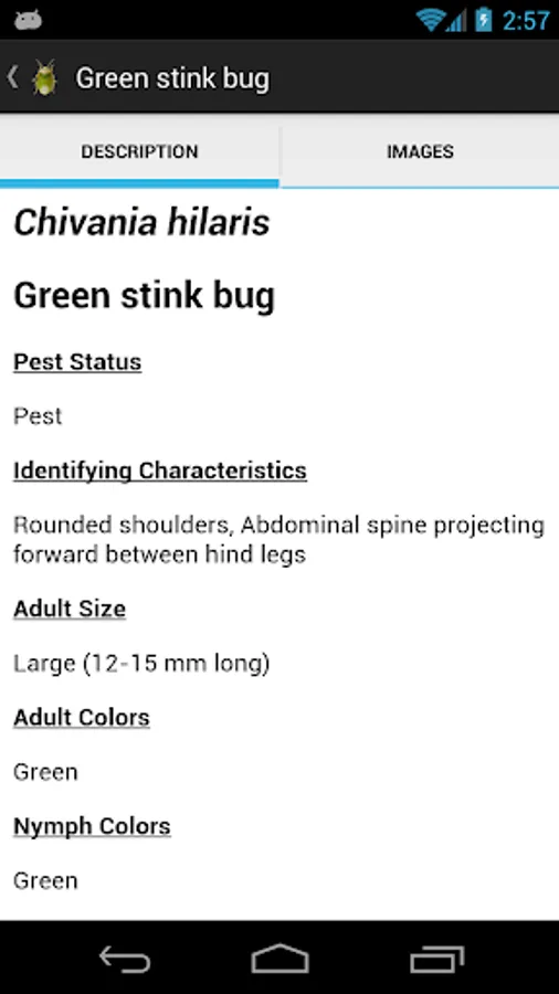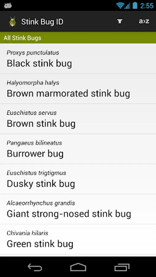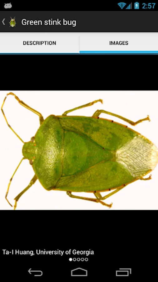 SE Agricultural Stink Bug ID is designed for use by university researchers, Extension specialists, county agents, consultants, scouts, and growers who need to identify stink bugs collected in agricultural settings. Images for most species include eggs, nymphs, and adults. Key characteristics of each species are highlighted to allow the user to easily identify a specimen in hand. Common names in parentheses indicate that no official common name has been adopted by the Entomological Society of America. The app was developed by the University of Georgia Center for Invasive Species and Ecosystem Health and the Department of Entomology, units in the College of Agricultural and Environmental Sciences, with funding from Cotton Incorporated.