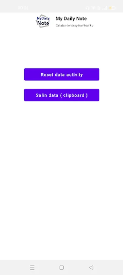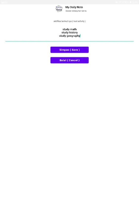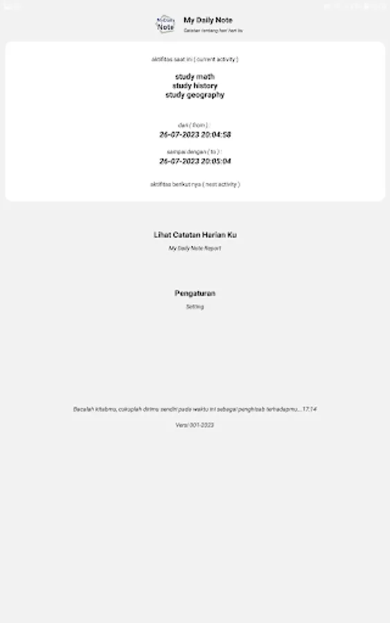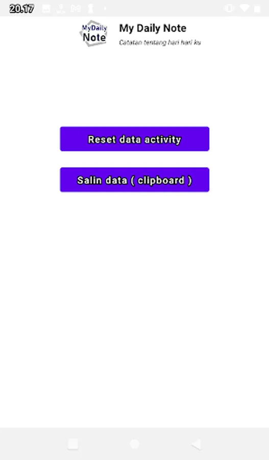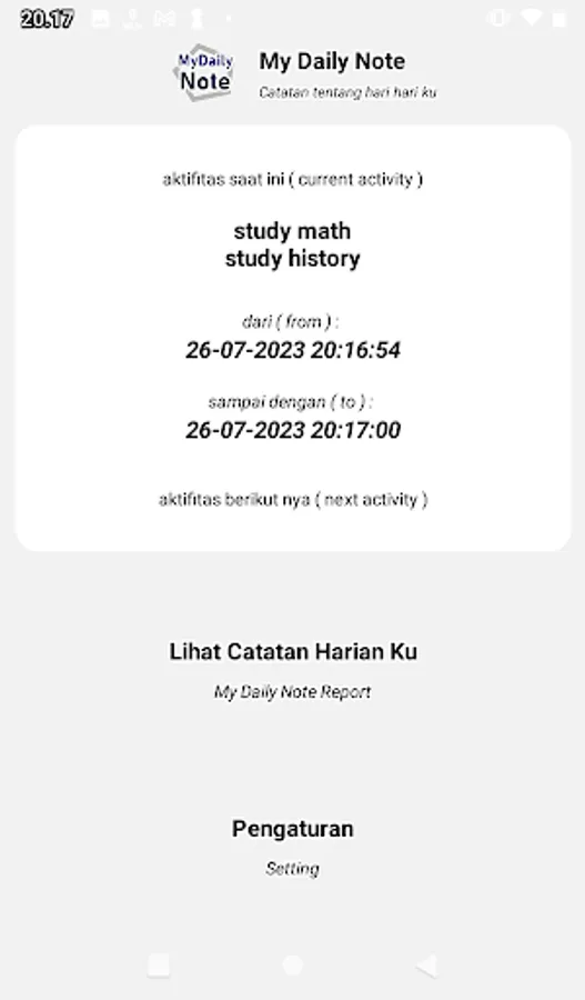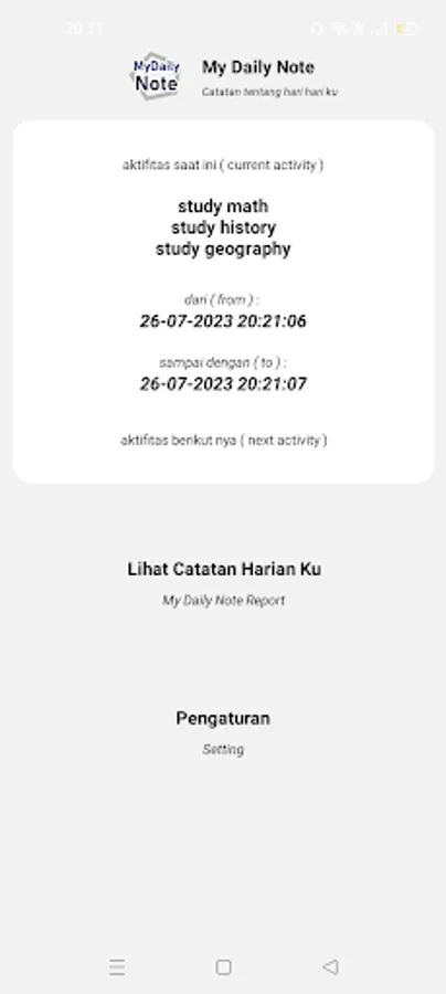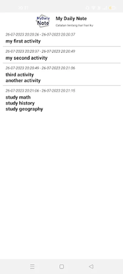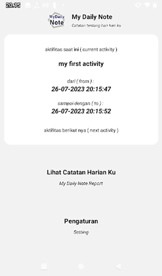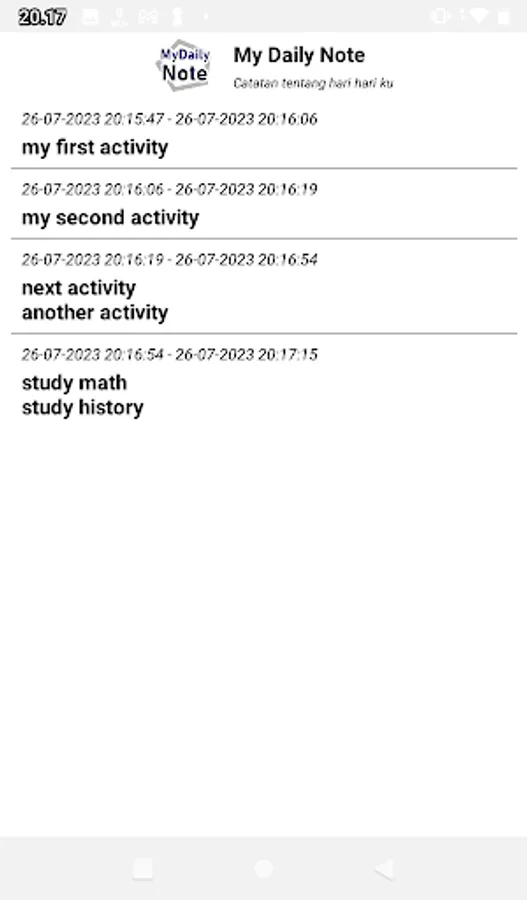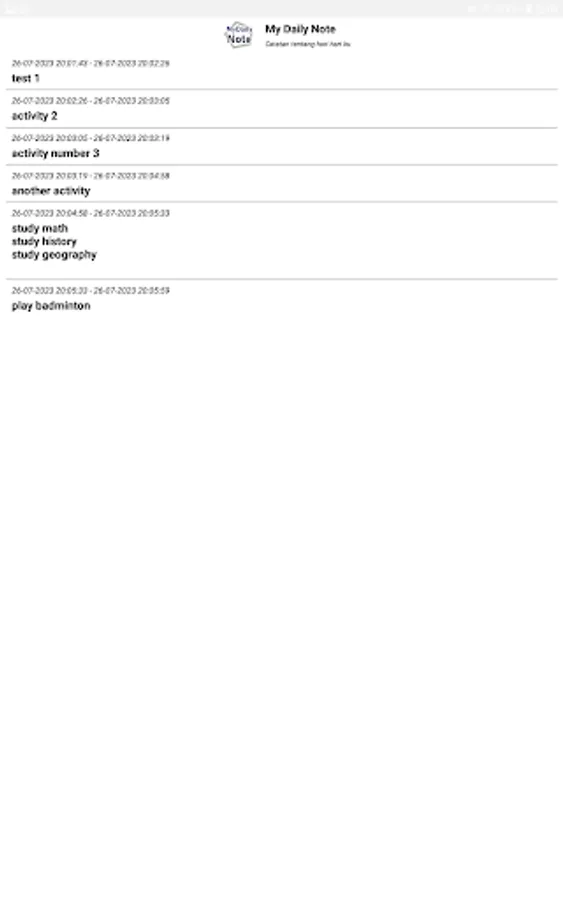My Daily Note is an application that can be used to log daily activities. We can input any activity and its start time, then, input the next activity, automatically, the application will save the previous activity with its start and finish time. It can be used for daily basis, and it also provides a feature to copy the recorded activity log into clipboard, so, it can be pasted easily to any other application. By using this application and its time log data, so anyone can review and analyze the data to improve their productivity.