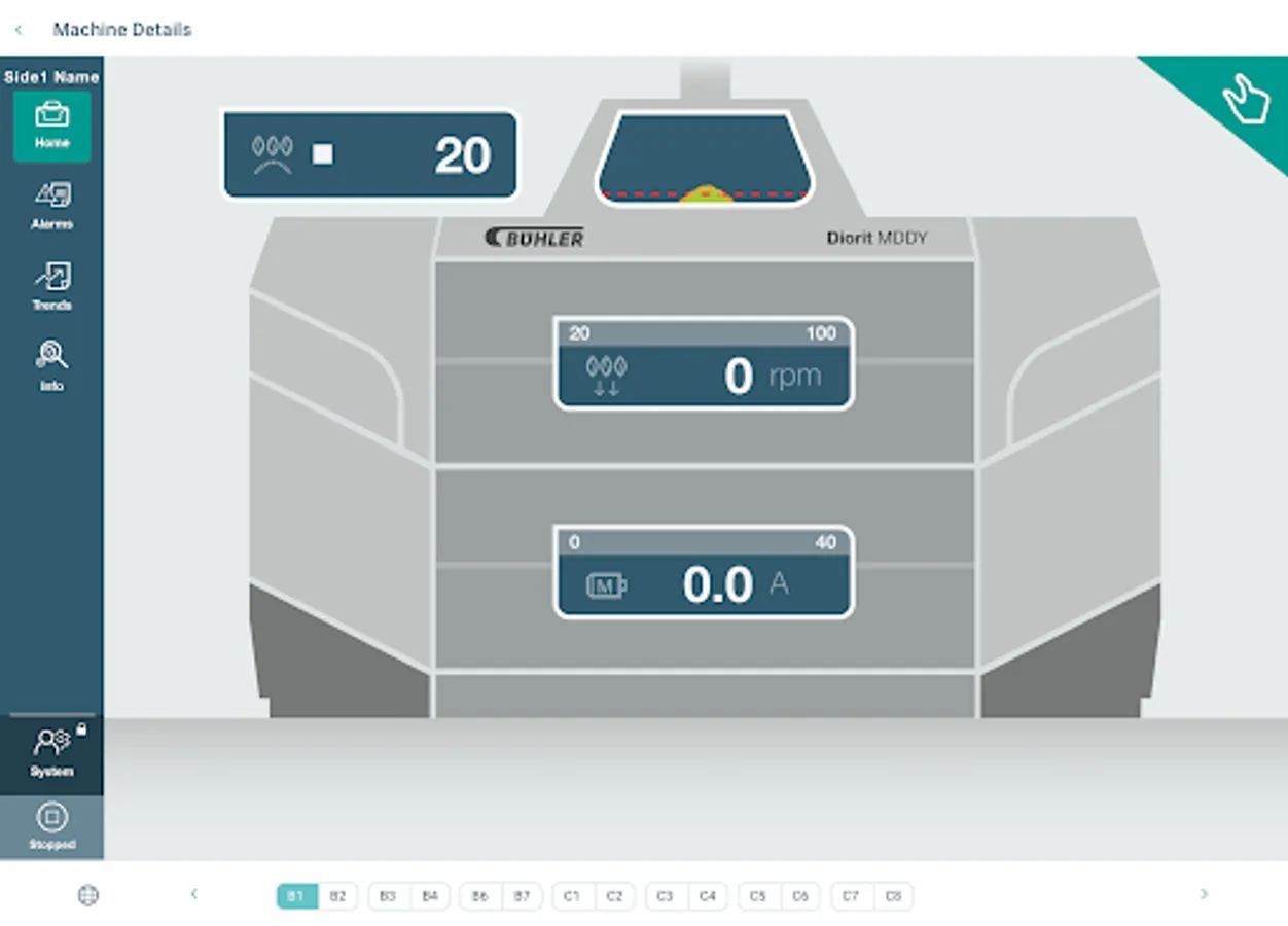 Bühler Remote enables user to access the machine’s webserver and show its state in an overview. The mobile application allows the user to