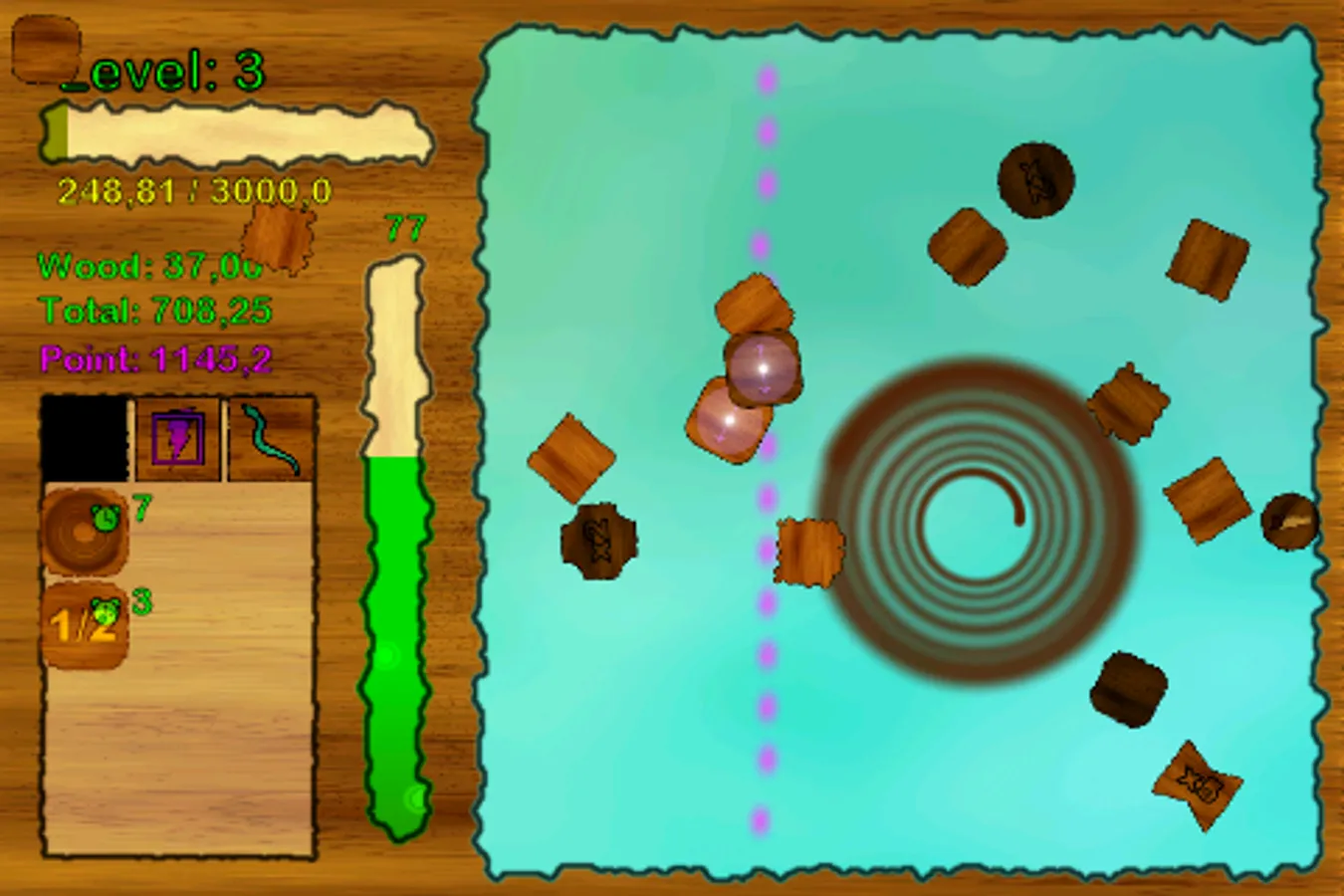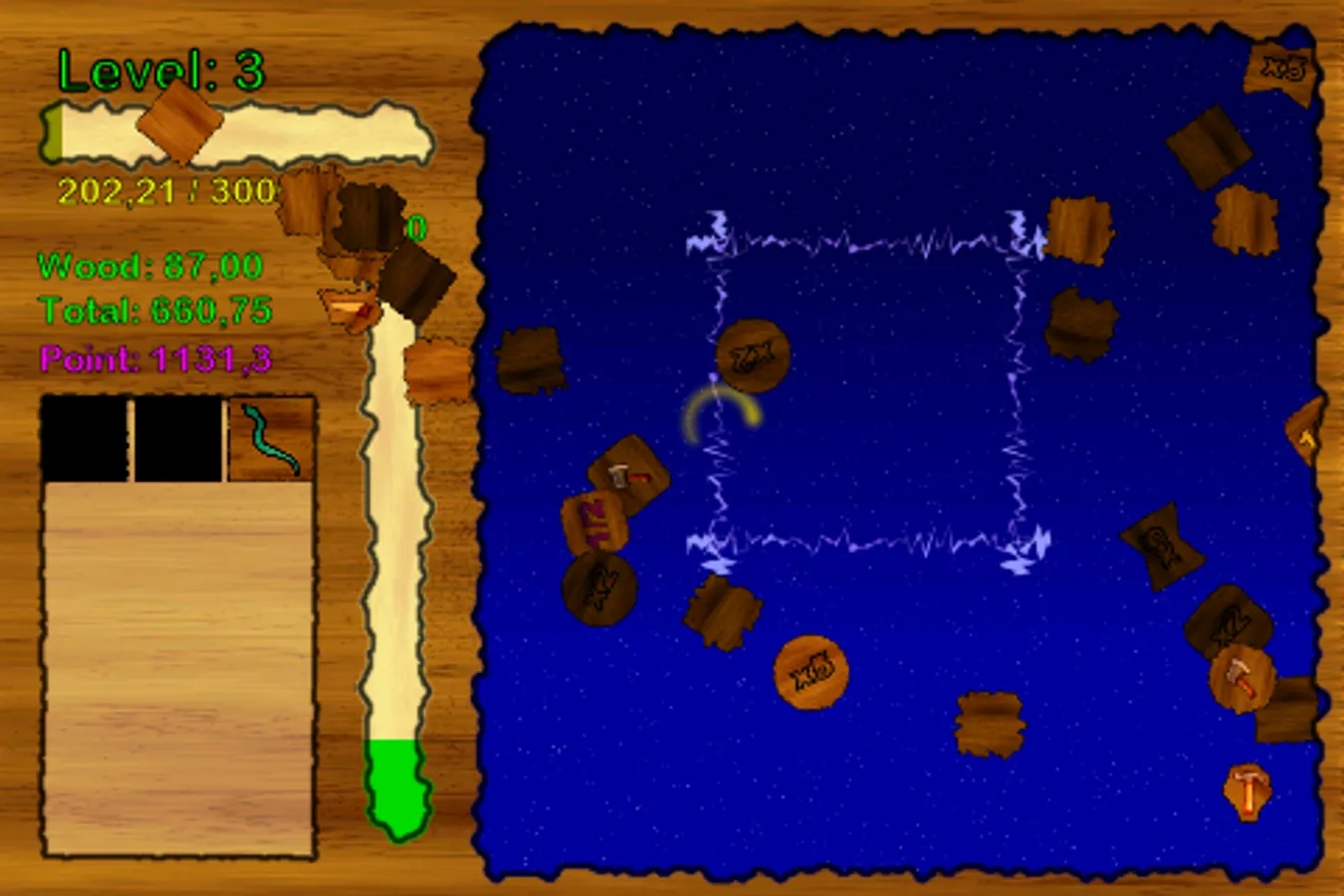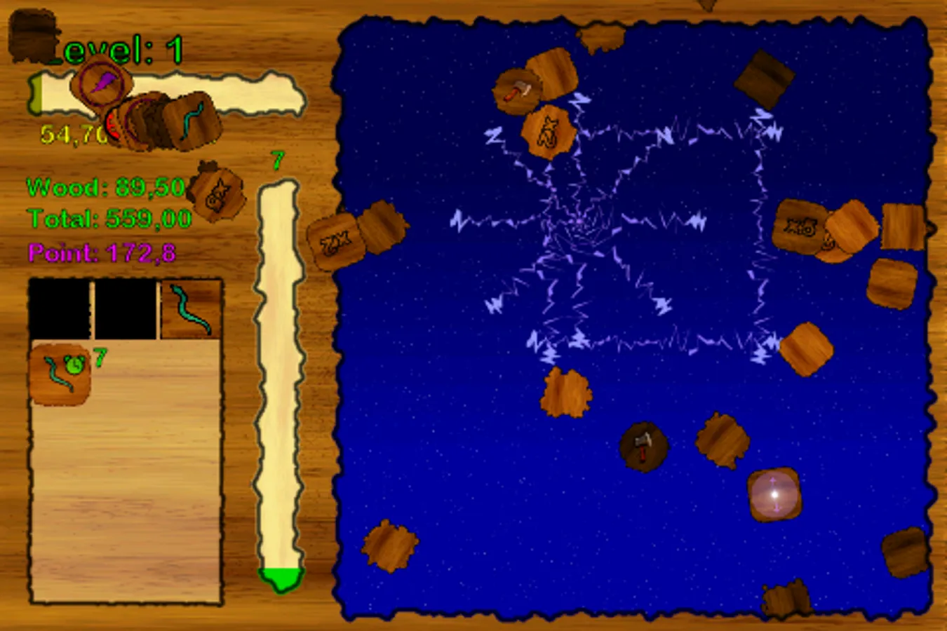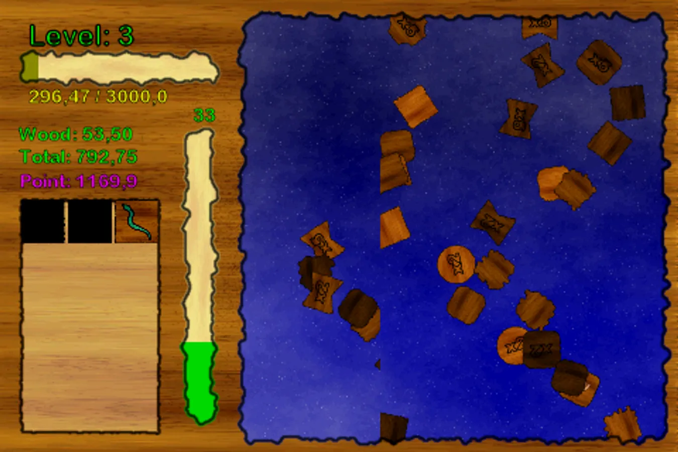You must collect woods for build your house. You can use your powers for collecting more woods. And you will gain experience. Then upgrade your level and skills. You can collect more woods and gain more experience with your upgraded skills and powers.