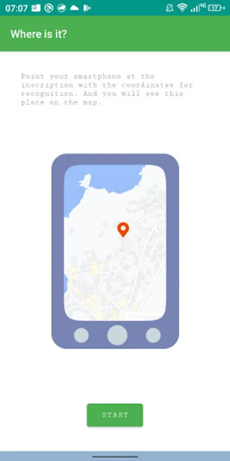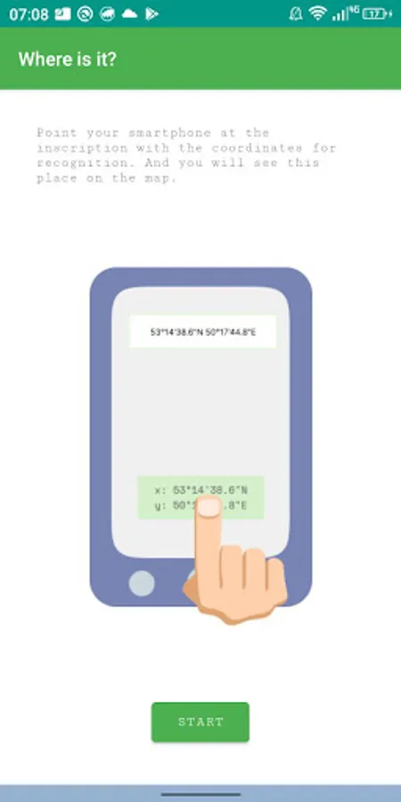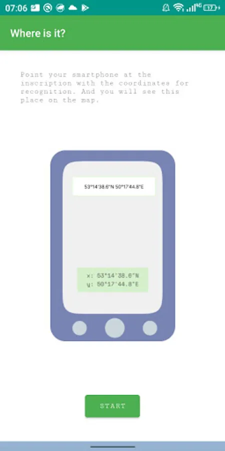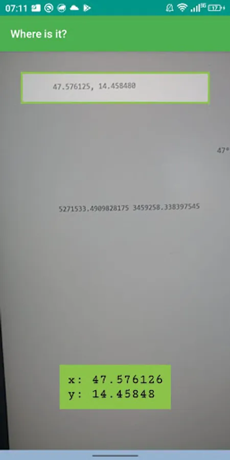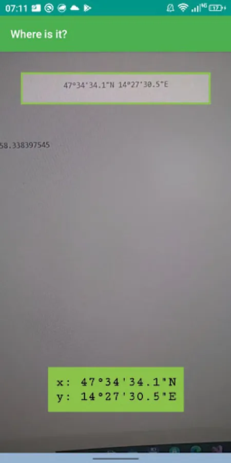 The application, when pointing at the inscription of the camera lens, recognizes the coordinates, which can later be displayed on the map.