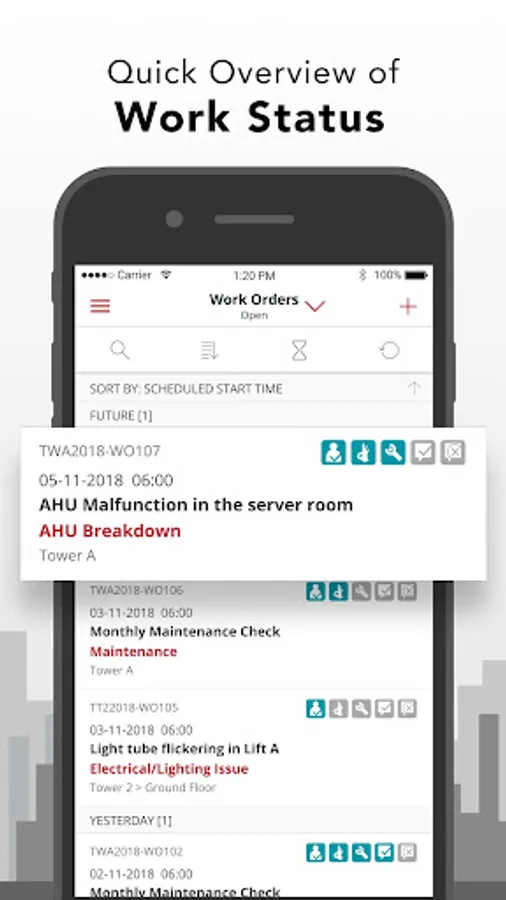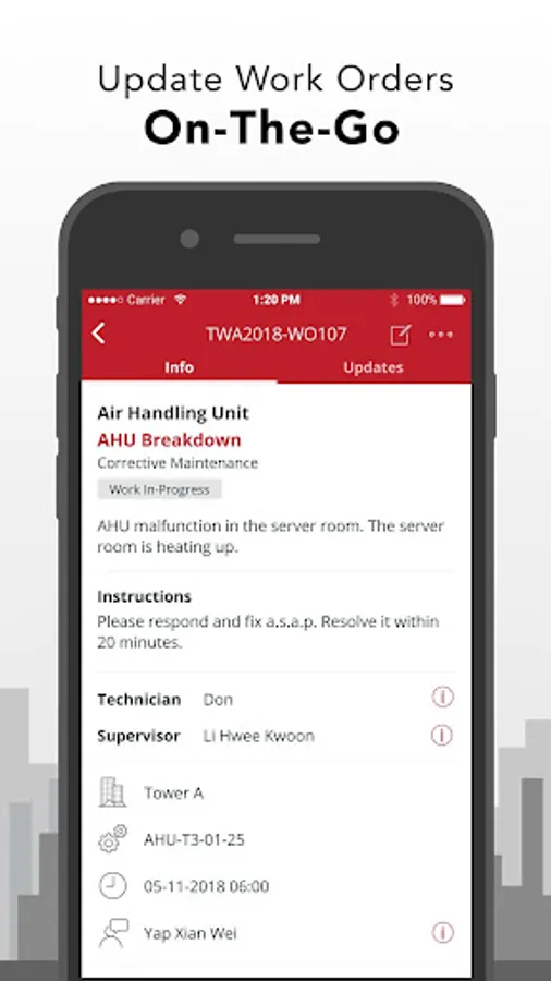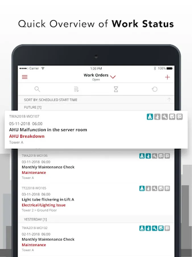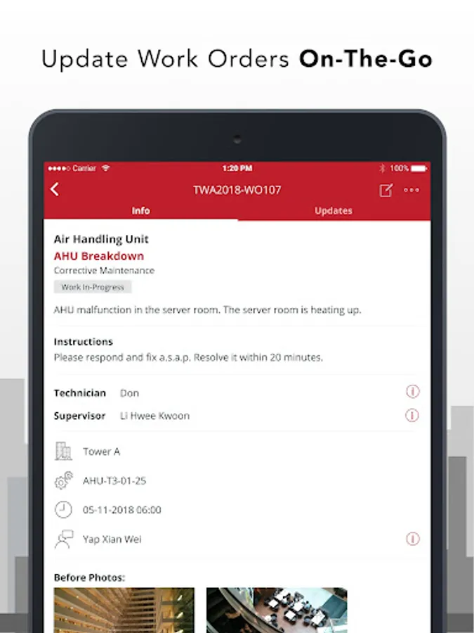 BUILDFOLIO by SQL View is the state-of-the-art facilities management software solution that is trusted by premium properties in the region. This application is a useful tool for the FM operation team in the field and complements the Work Order Management module in BUILDFOLIO web application. It allows the operation team to update corrective and scheduled work orders on the go, take Before and After photos, and complete checklists. It also enables a work requester to validate and accept a completed work order by signing on the work order form.