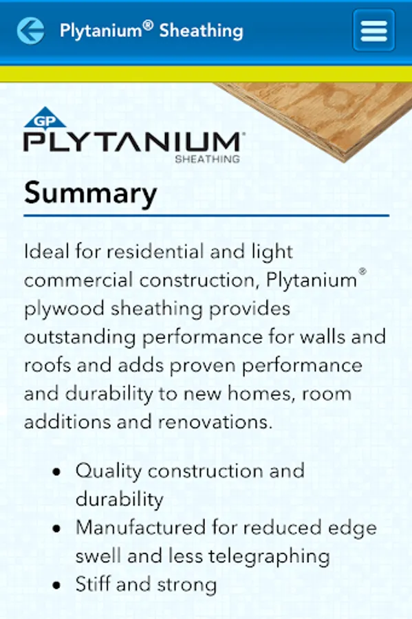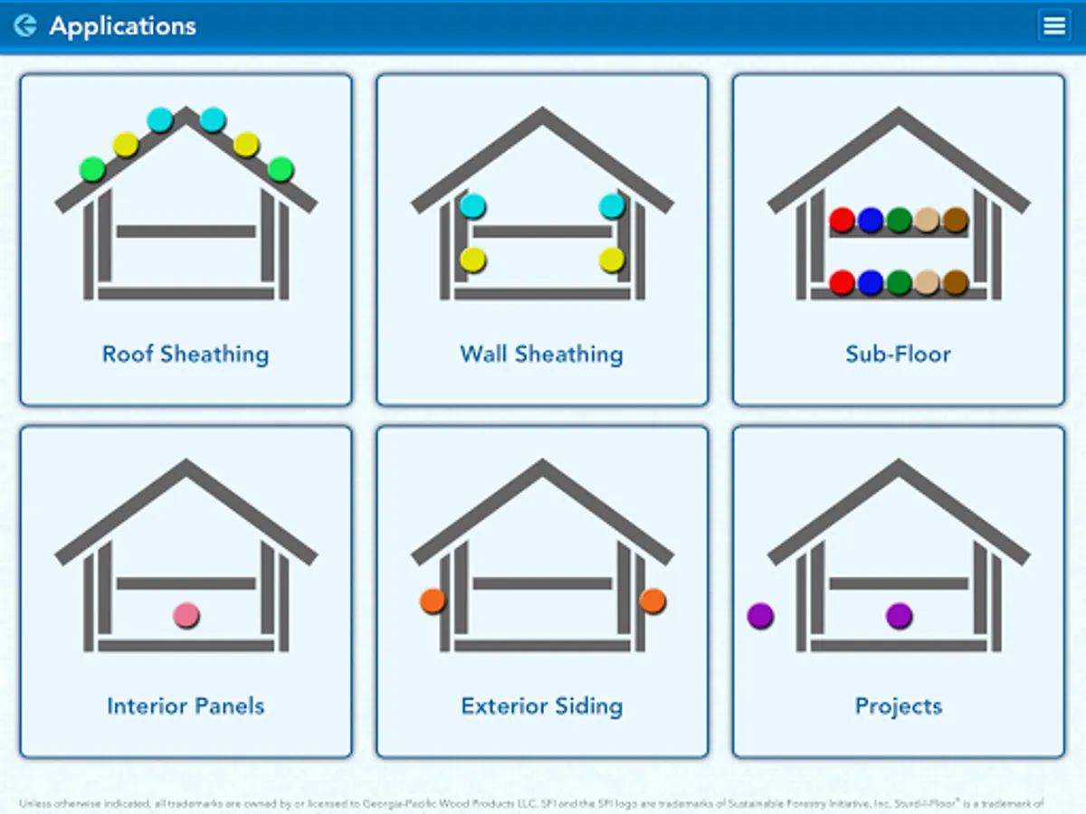 This free app from Georgia-Pacific features an easy-to-use house icon with product links to help find the right structural panel for your home or project needs. No matter if it is for exterior wall sheathing or siding, roof sheathing, sub-flooring, real wood interior wood panels or another project around the house.