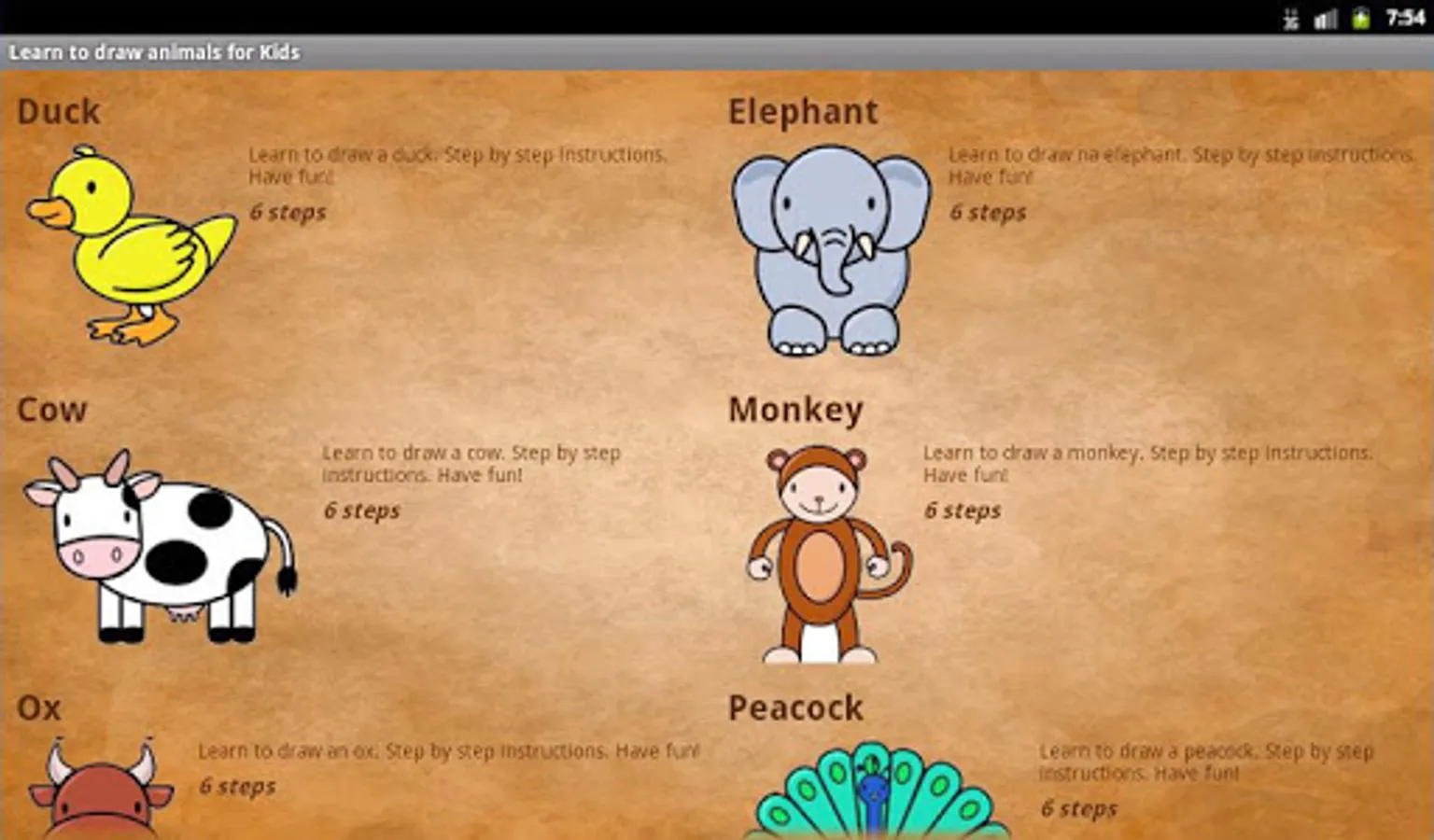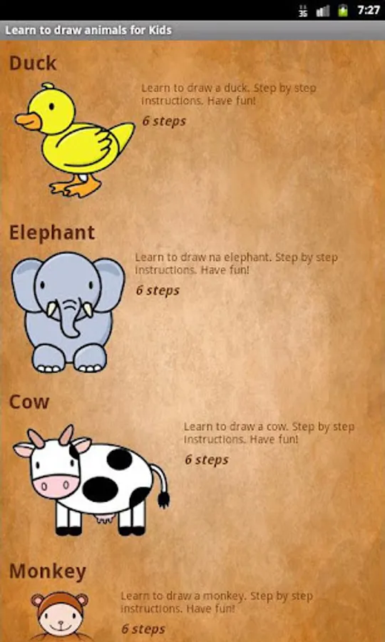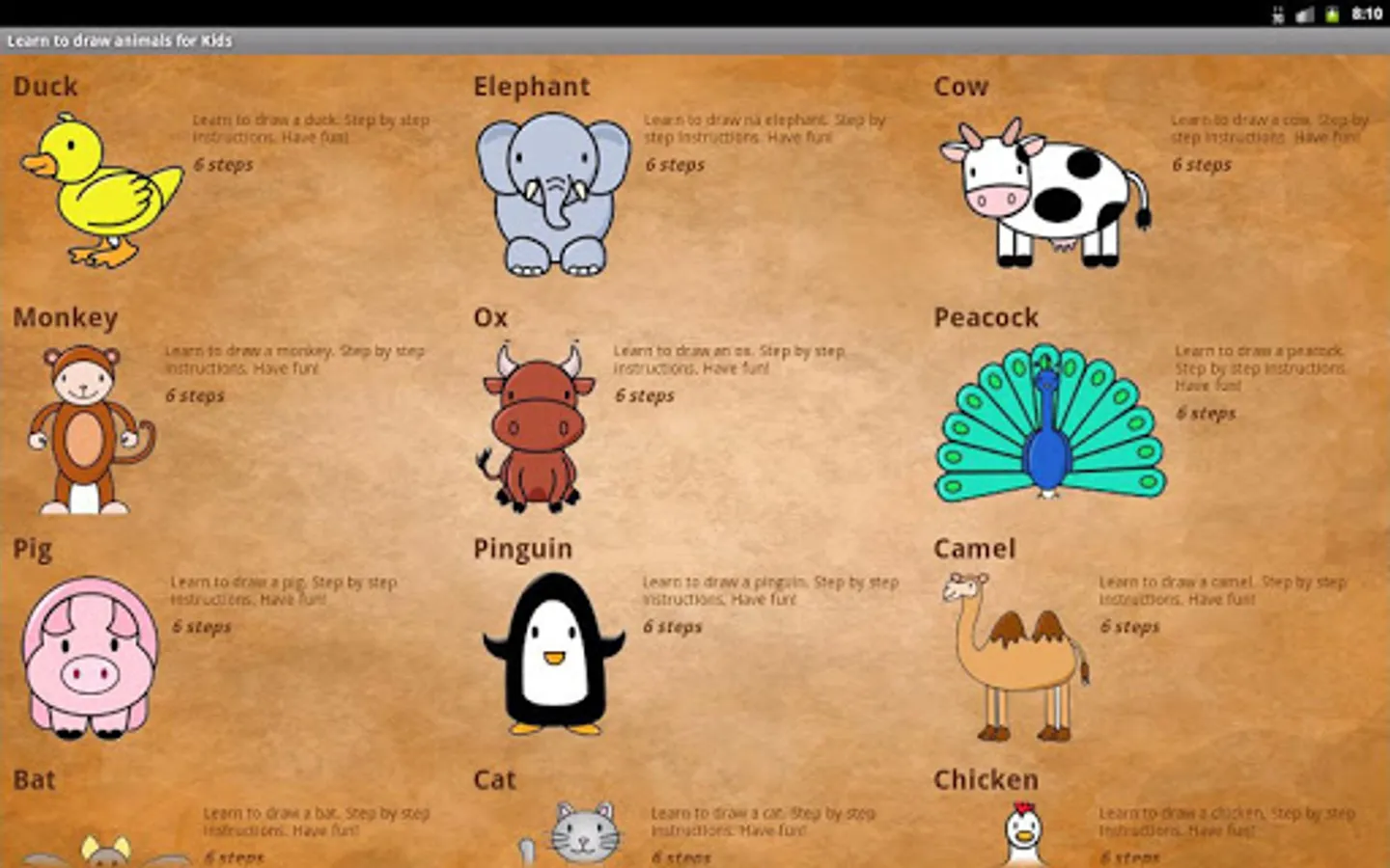 Draw a cow, duck, elephant, goat, cat, chicken, tiger, dog, horse, monkey, snake and many other animals. Have fun!