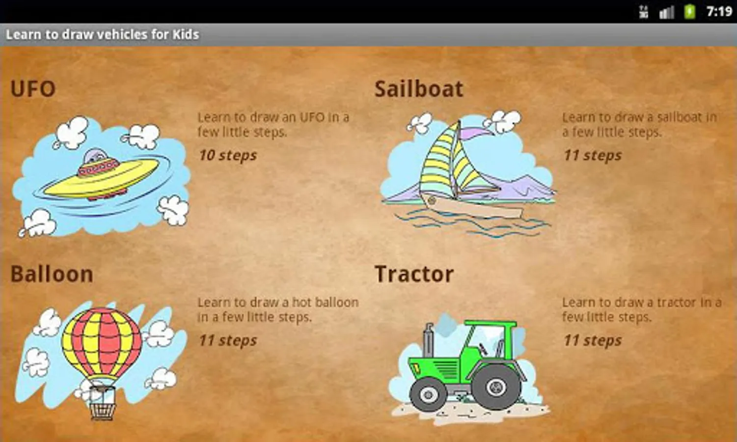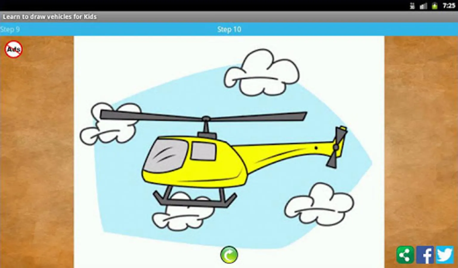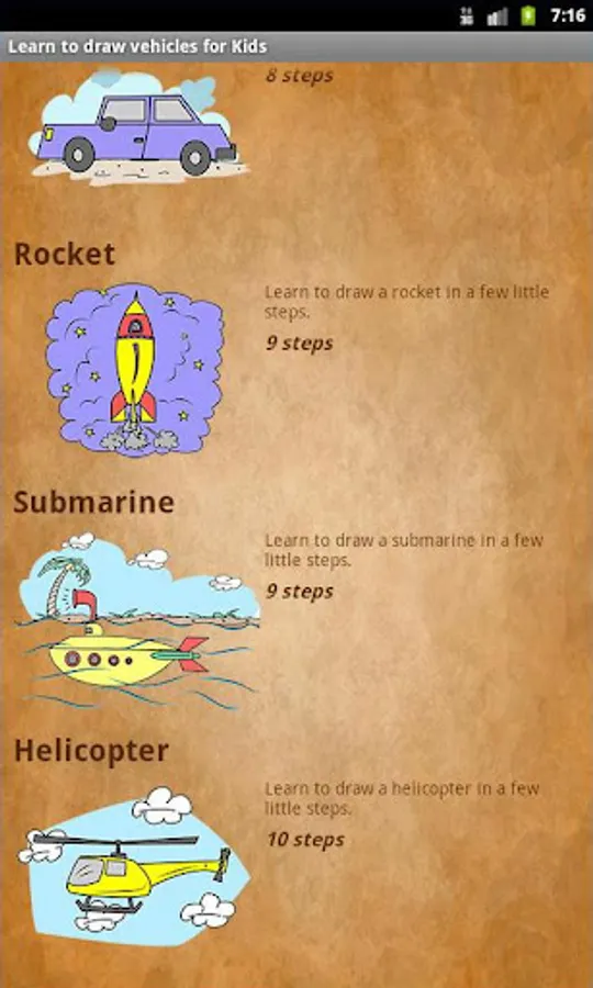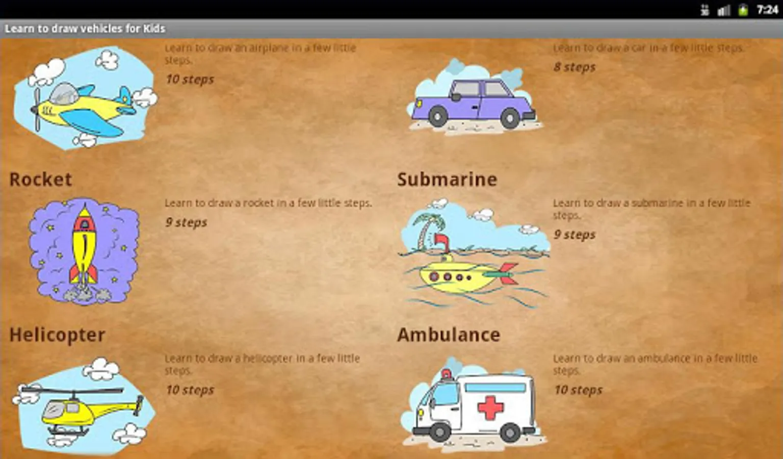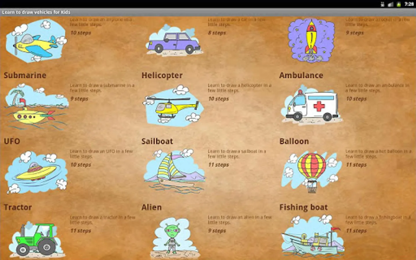 You will learn to draw a car, boat, helicopter, truck, airplane and many others. Have fun!