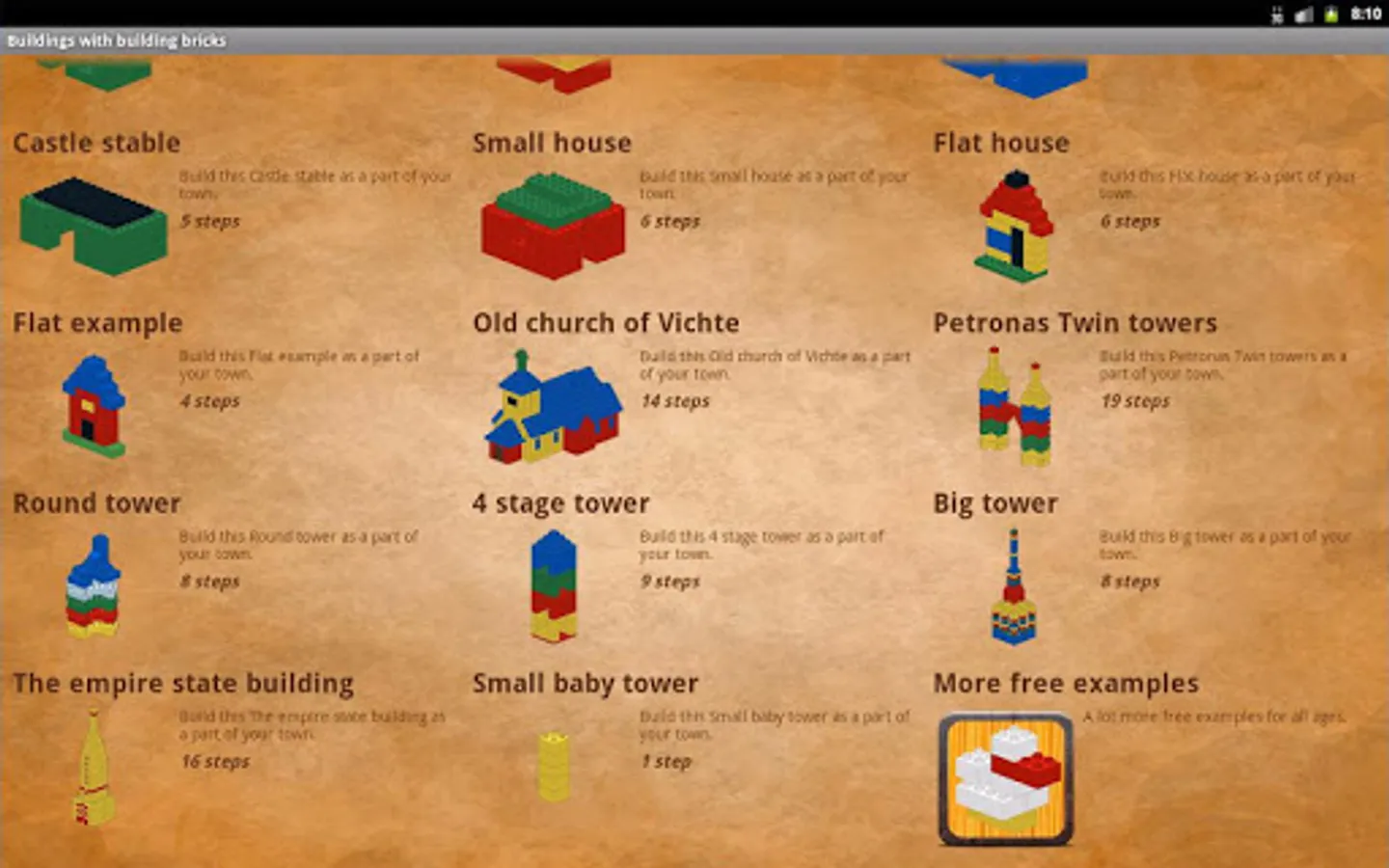 Create buildings with simple step-by-step instructions. Playing is fun and will add a lot the development of motoric skills. This puzzle game is really for all ages. Bring the bricks together and follow the color pattern. Have fun creating a house, tower, castle and even the empire state building.
