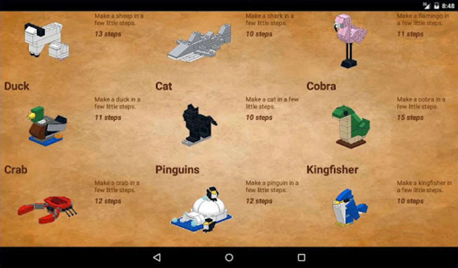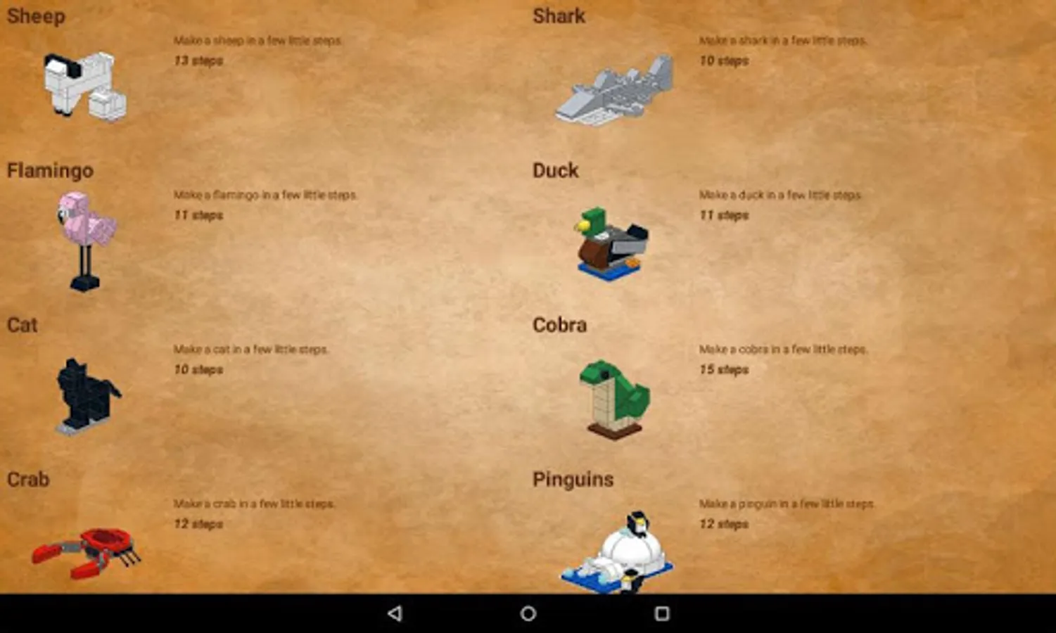 Get ready to play with the animals! These exotic animal examples have everything you'll need for a zoo. There is a shark, cobra, moose, an owl and even a sea turtle and many more. Open your animal kingdom and play with the brick fish, crab, sheep or the pinguin igloo house. The animals are divided into sub-models for easy building and instant play! Create those elegot figures. Use alternavite colors and create your own flamingo, crab or cat.