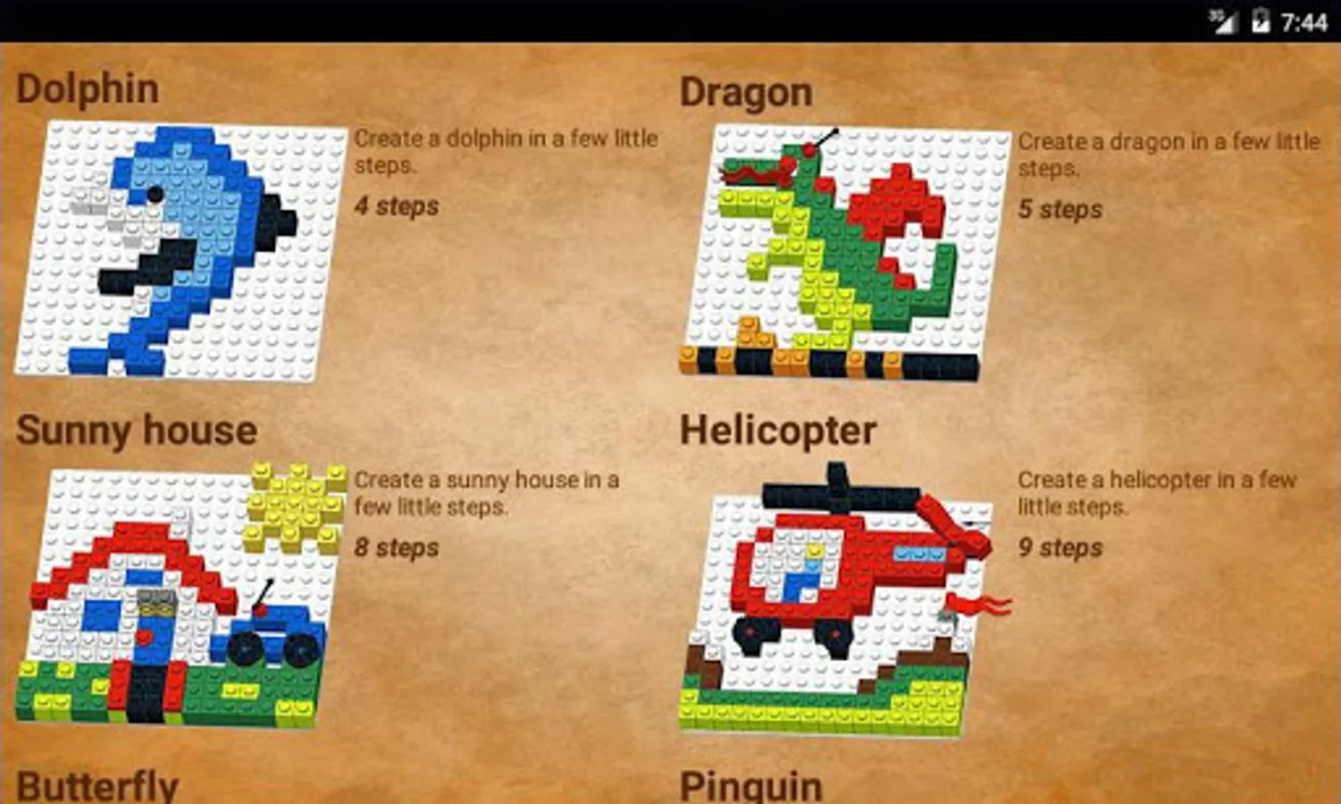 Get ready to play with the mosaics! These examples have everything you'll need. There is a dolphin, dragon, sunny house, helicopter, butterfly, pinguin, heart, tractor, girl with dog, fish, red car, super hero, crab and many more. The mosaics are divided into sub-models for easy building and instant play! Create those elegot figures. Use alternavite colors and create your own house, car, animal or robot.