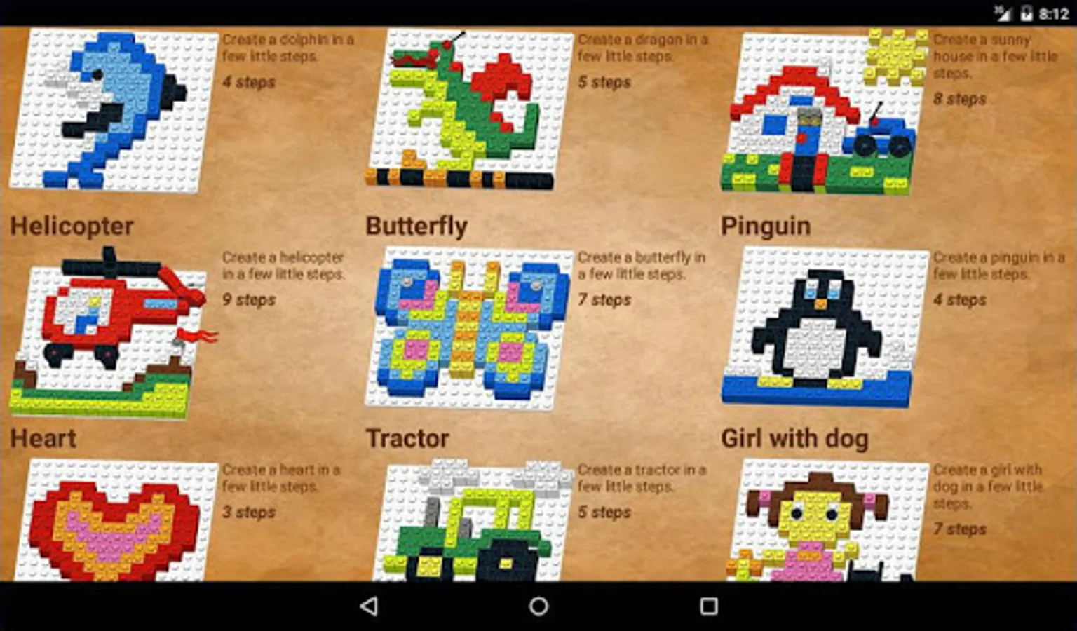Follow the step-by-step instructions to build mosaic block figures. Playing is fun and will add a lot the development of motoric skills. This puzzle game is really for all ages. Bring the bricks together and follow the color pattern.