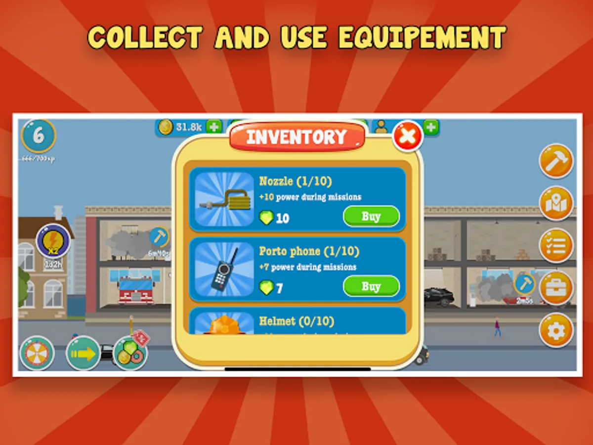 - Collect nozzles, helmets or axes to complete rescue missions easier.