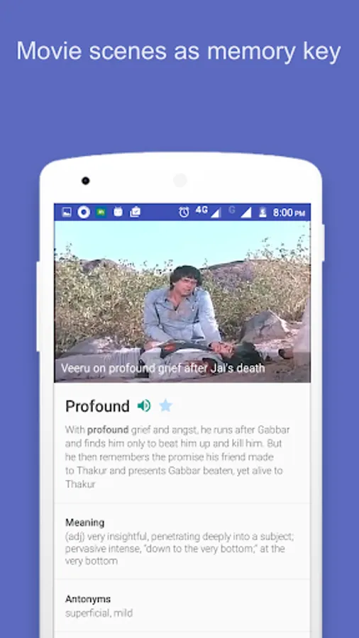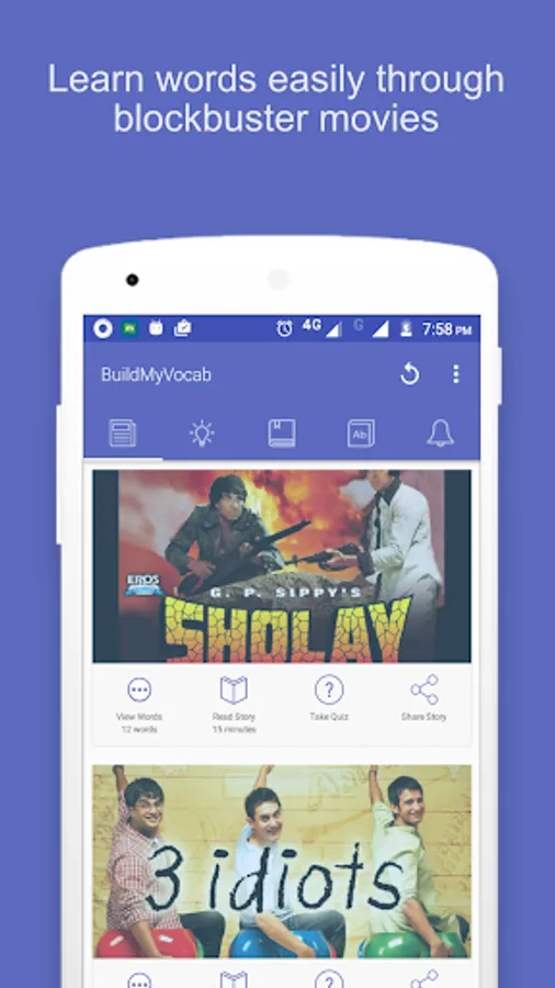 "Build My Vocab" gives you the opportunity to master the most globally used language by associating it to films that you have grown up watching. You've laughed with the characters, cried for them, hated them- and basically associated all sort of sentiments while spending three hours watching them on the silver screen. And what better way than brushing your English language skills than associating words with these movies?