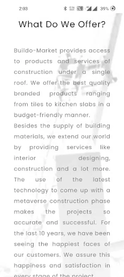 We, the Buildo- Market is one of the topmost building material suppliers and construction companies with an experience of one decade. We always focus primarily on the happiness of our clients and our objective is to have cent percent customer satisfaction. We, thus, find all the possible ways to attain our objective. The use of most modern technologies like virtual reality to have a metaverse of Buildo-Market help our customers to choose and upgrade the project in the perfect way they need.