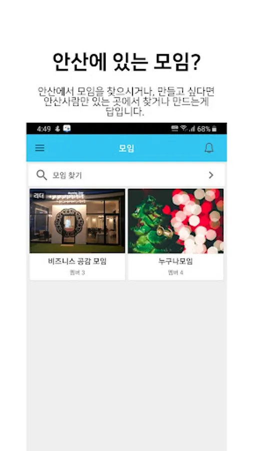 터치 한 번으로 안산의 모임 리스트를 확인할 수 있고, 가입할 수 있도록 되어 있습니다.