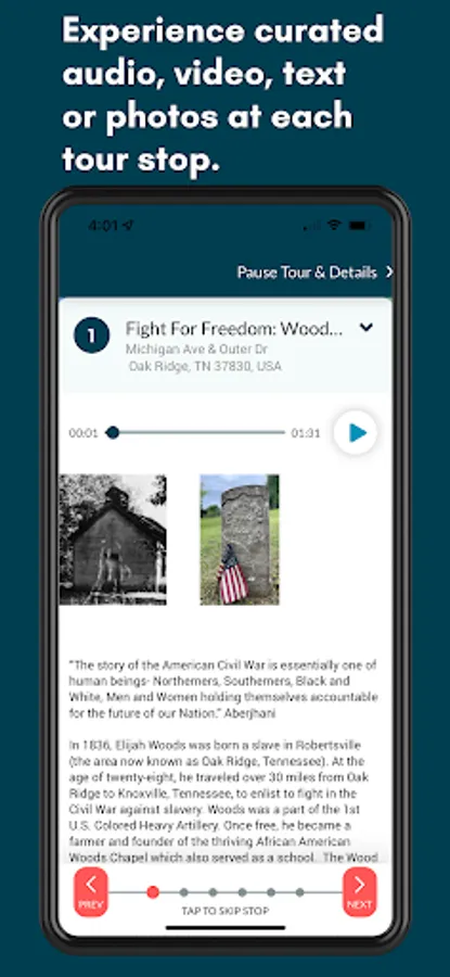 No need to meet up at a certain time or walk around with a group. The app delivers all of the Tour Creators’ content to you. Simply start and pause your tour as you wish. See a great park along the way? Just pause your self-guided tour, and start your tour again when you are ready.
