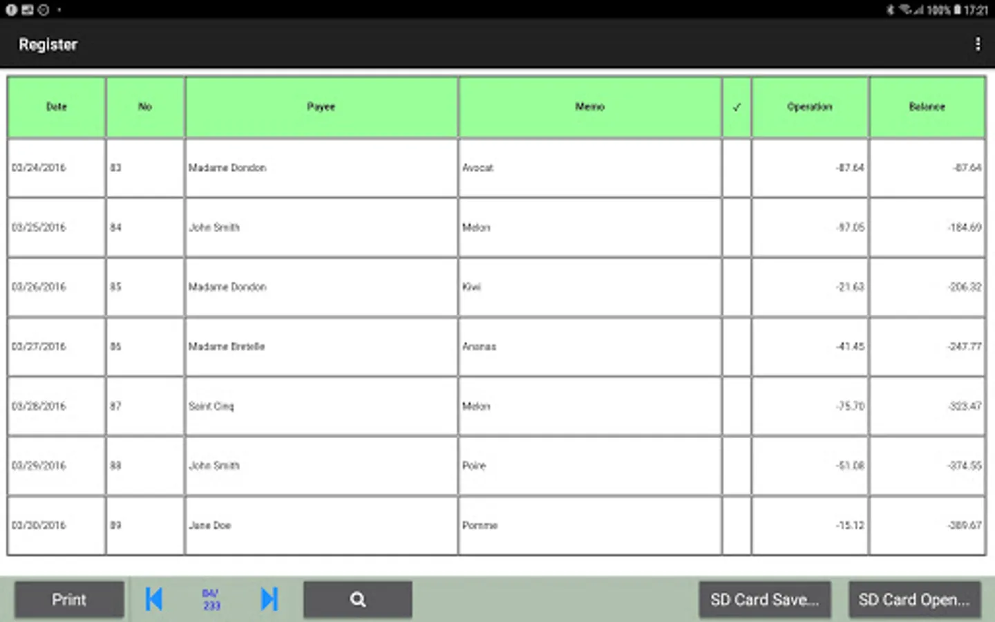 That register can be modified at will. Lines can be added or deleted, to do the same as with a paper checkbook. Transactions can be reconciled, with a check mark.