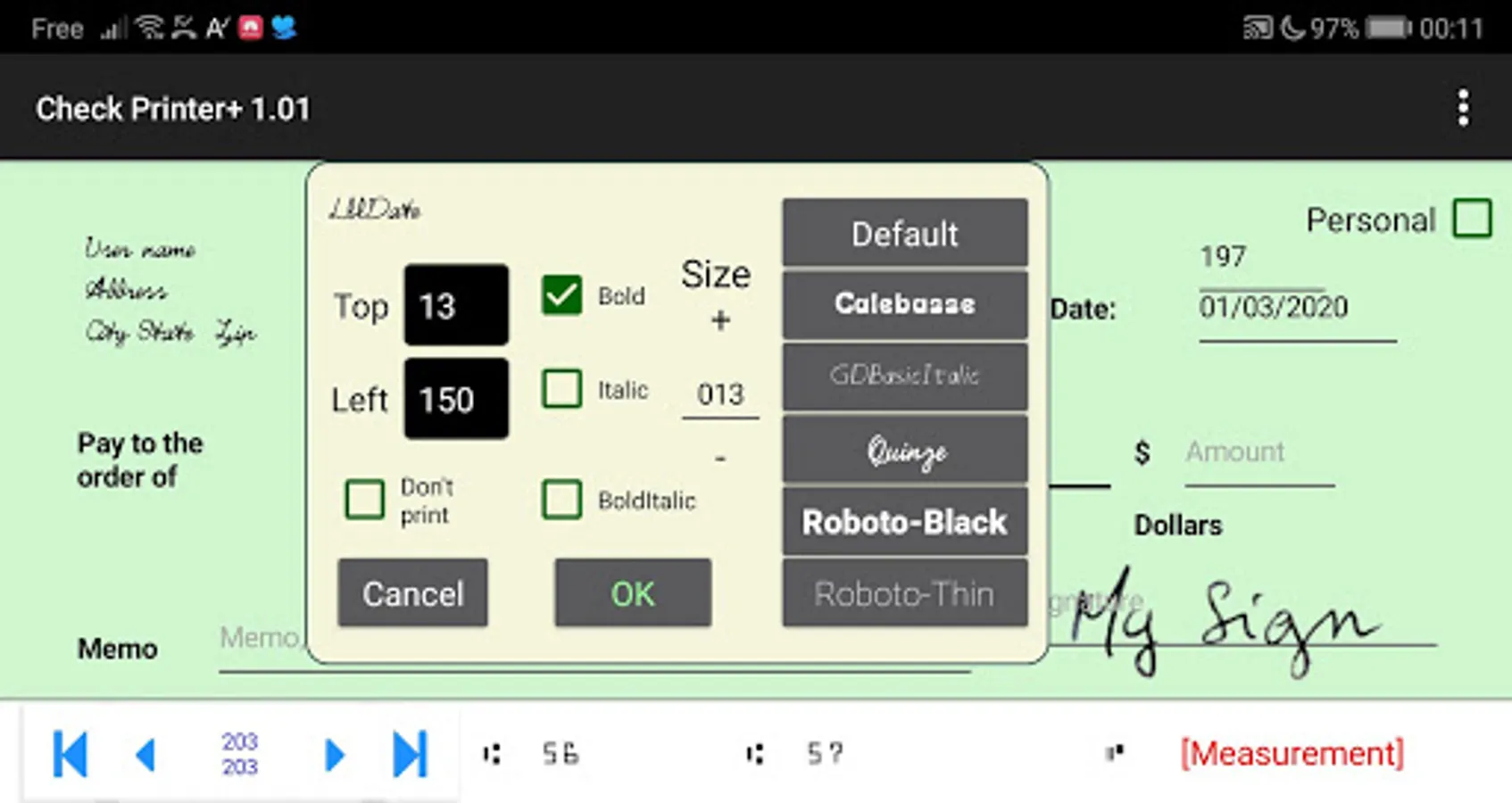 This app is simple to use, but has lots of customization features. All elements of the check can be moved. Each one can be positioned naturally in millimetres, available on any twelve inches ruler. That will reflect on screen, as well as on the printed page.