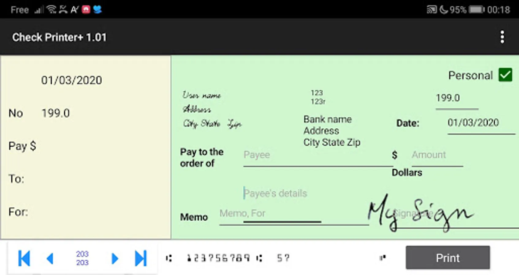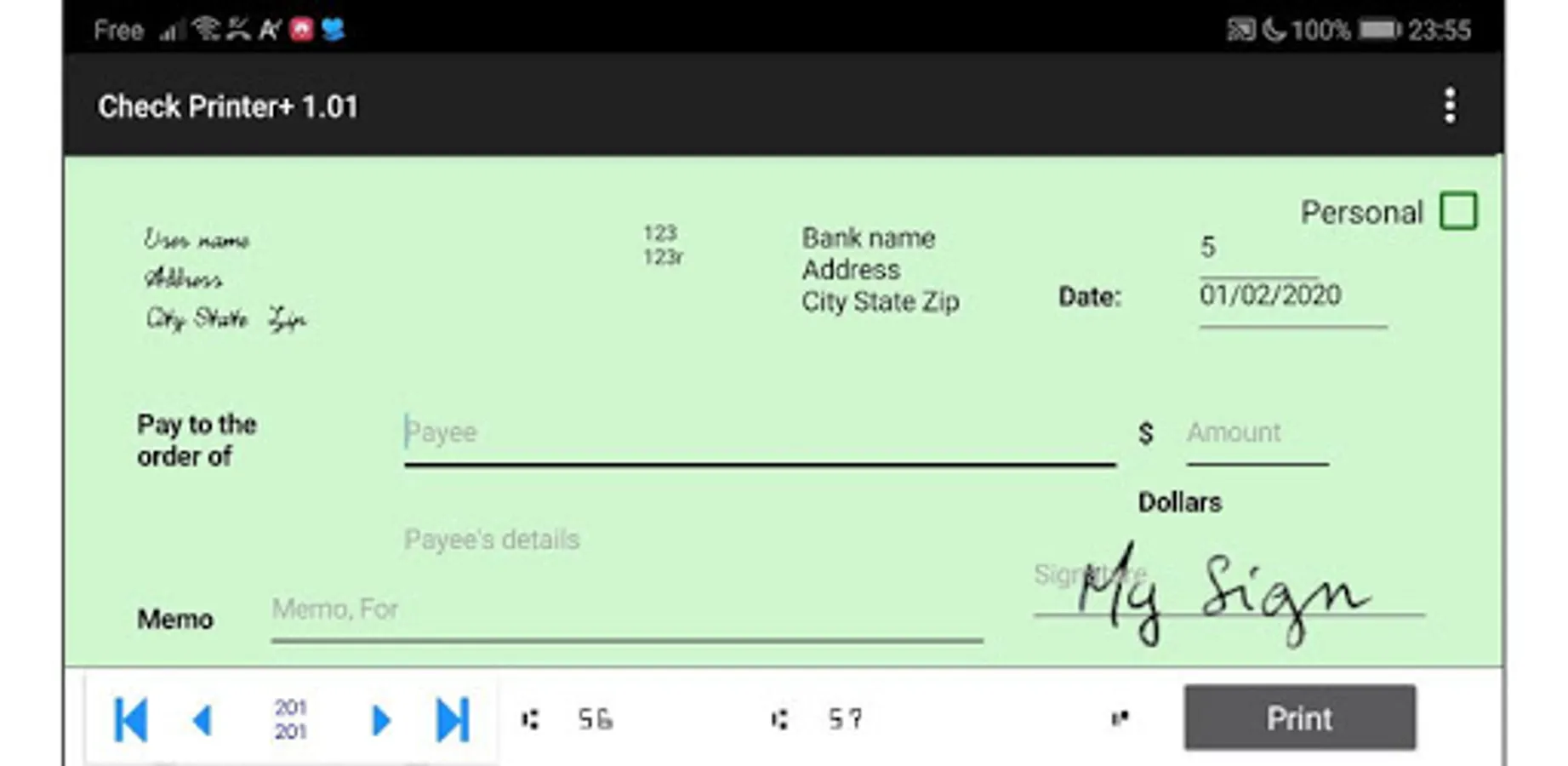 Check Printer Free will sign your checks automatically with your own picture, or simply with text content.