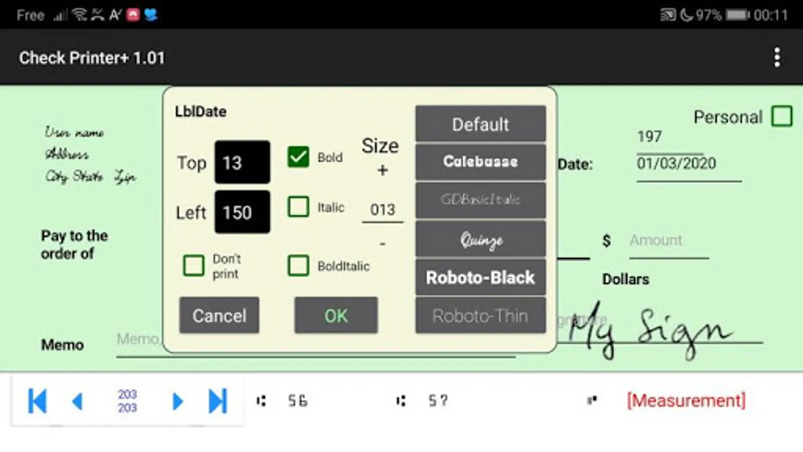 All elements of the check can be moved to perfectly fit your needs, and you can decide which elements will be printed (convenient for pre-printed paper).