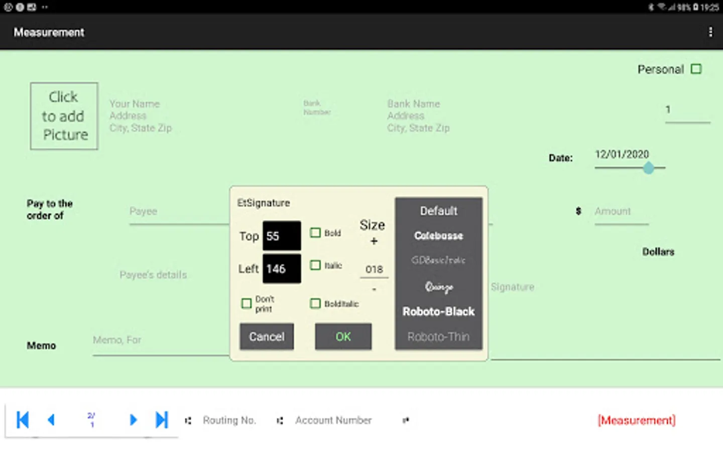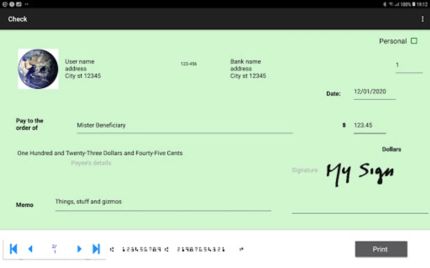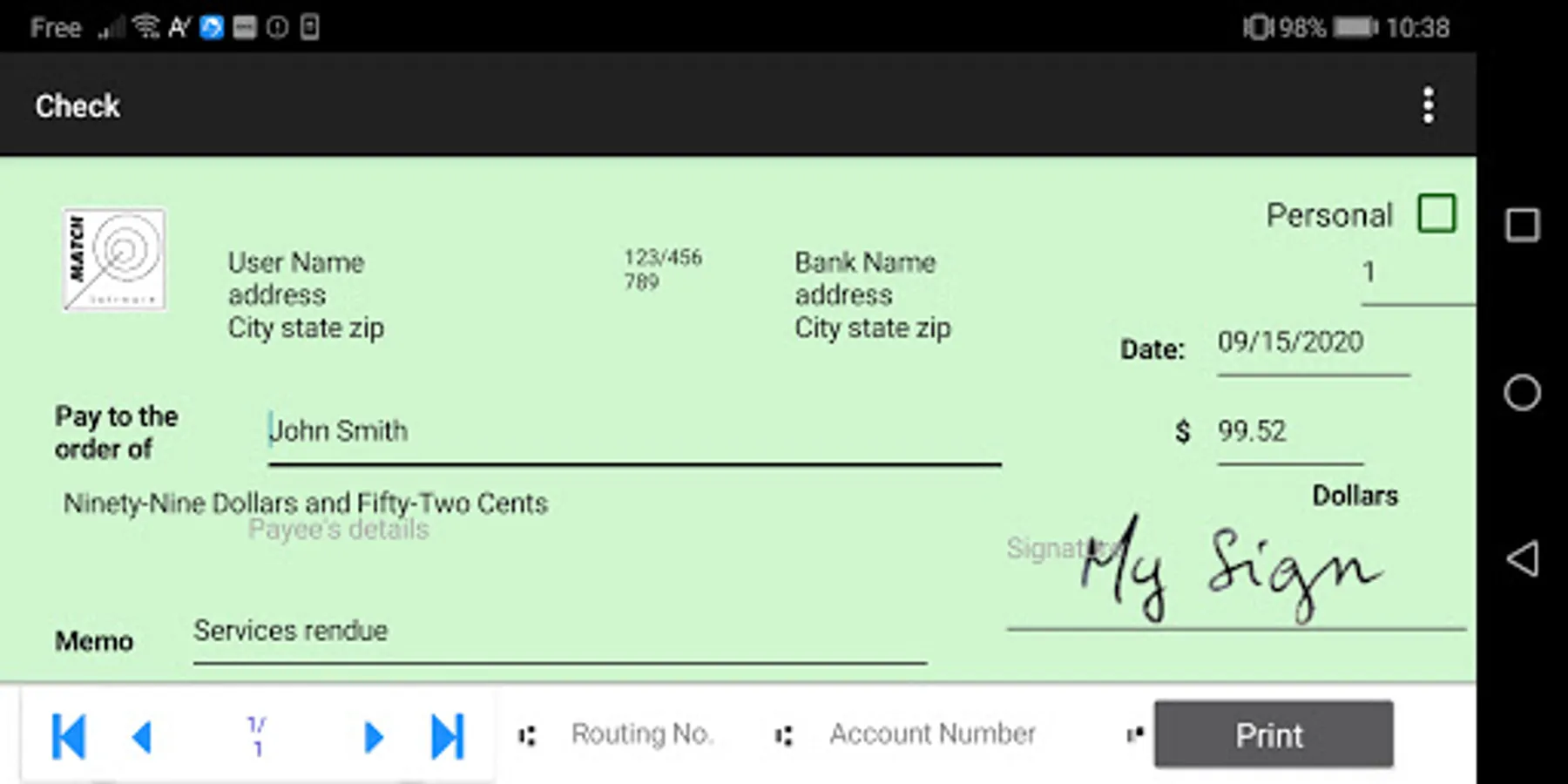 Print checks and their cover letter on the same page directly from your Android device with this easy to use check printing application : enter the order (payee), the Dollar amount, and voila ! Check Writer+Letter will automatically generate the word amount so you do not have to worry about spelling it out. You can also print blank checks to take with you.