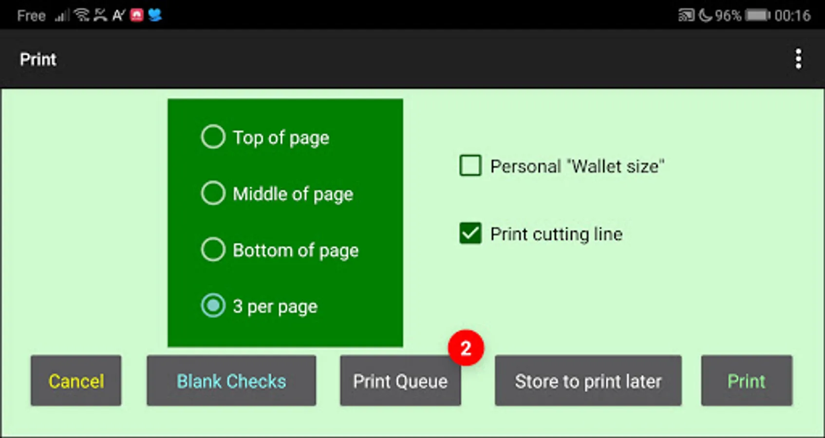 This free version print checks only on top. The full version you can purchase inside will print on top, middle and bottom, as well as Personal (Wallet) size.