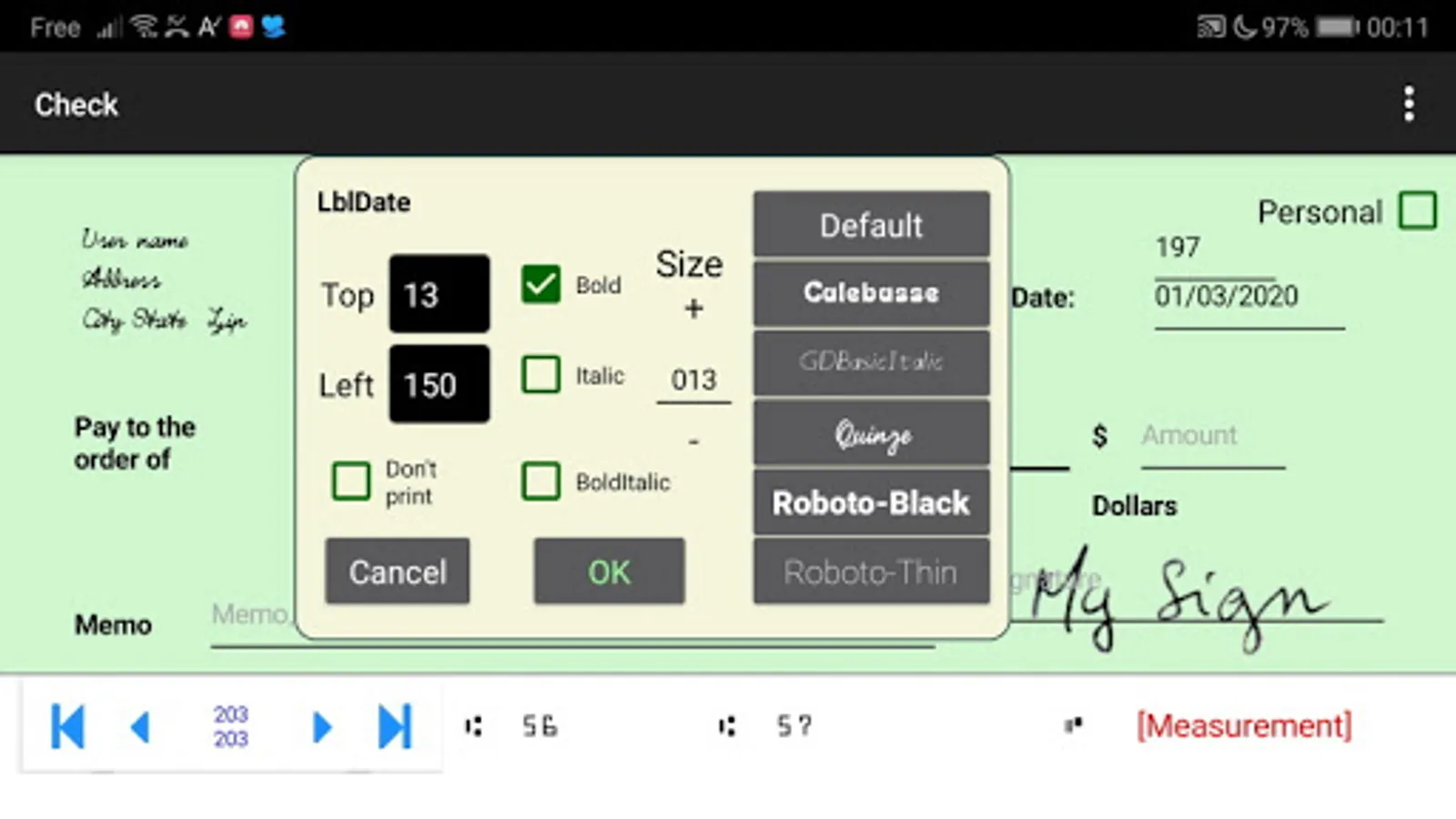 All elements of the check can be moved to perfectly fit your needs, and you can decide which elements will be printed (convenient for pre-printed paper).