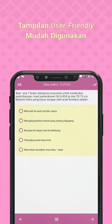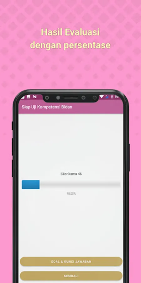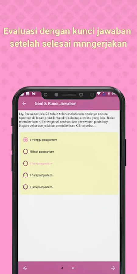 This application is designed as simple and light as possible, so it is very easy to use and does not burden storage. The evaluation system of the Midwife Ready Ukom uses a percentage, and is also equipped with a key that will help prospective midwives learn.
