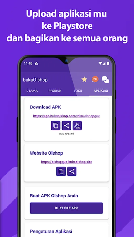 BukaOlshop will generate an APK file that you can upload to the playstore or install it yourself. The APK file generated by BukaOlshop is your own online store and you can manage the online store through the BukaOlshop application.
