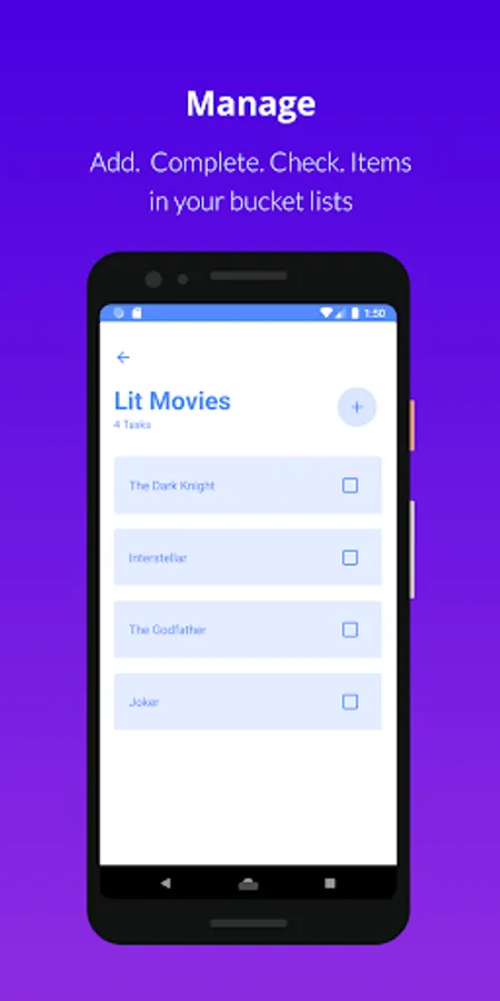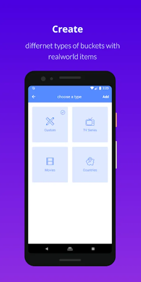 with Buketly you can create different kinds of Bucket Lists such as Movies, Tvshows, Countries to travel. Each bucket list Type has its own Store where you can explore thousands of option to select and add in your bucket lists.