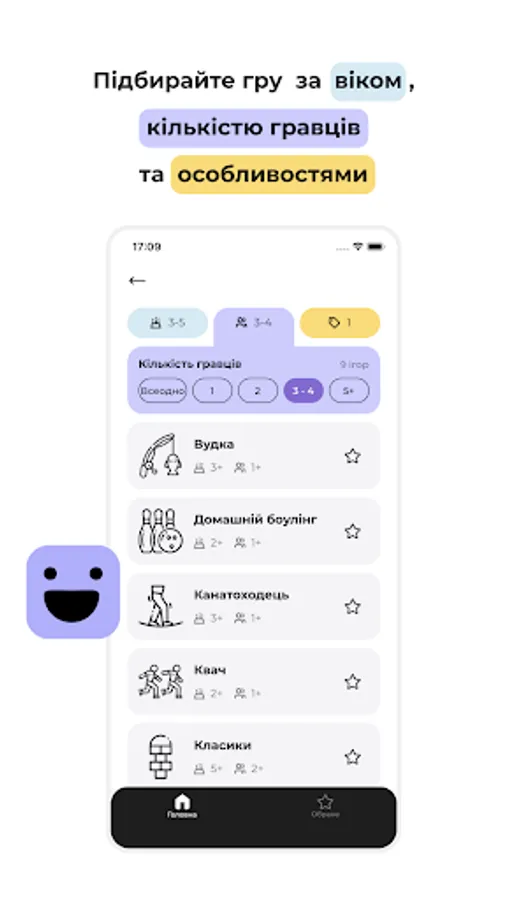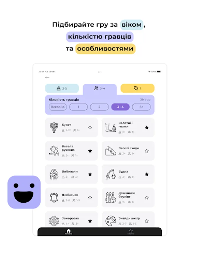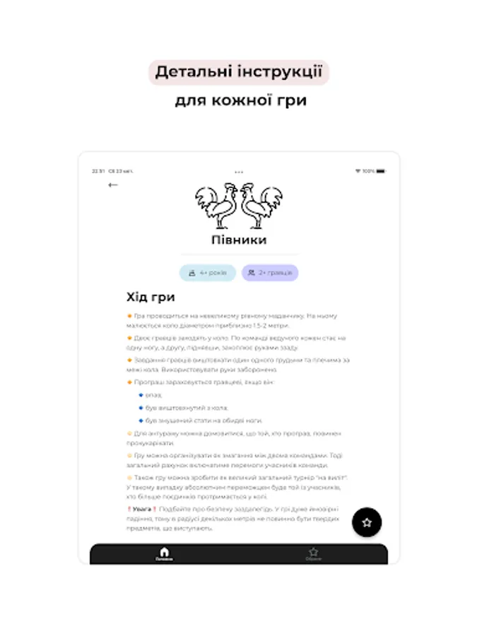 The collection of games contains detailed instructions, pictures, videos. The program makes it easy to sort games by age, number of players, space and skills. You can create your own collection of favorite games and plan a fun holiday.