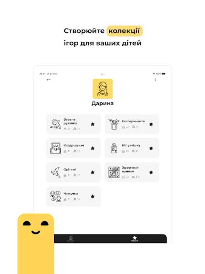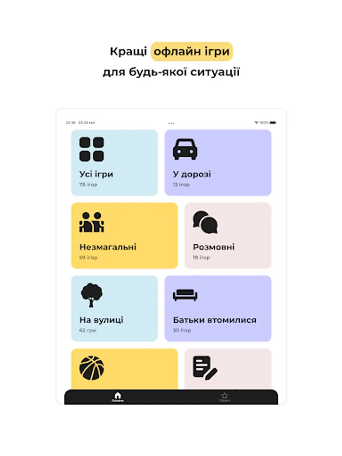 The application contains the best real games (without tablet and computer) for any situation. Such a cheat sheet for parents. The father can take care of the child's development without getting up from the sofa, and the educator can choose a game for a group of children.